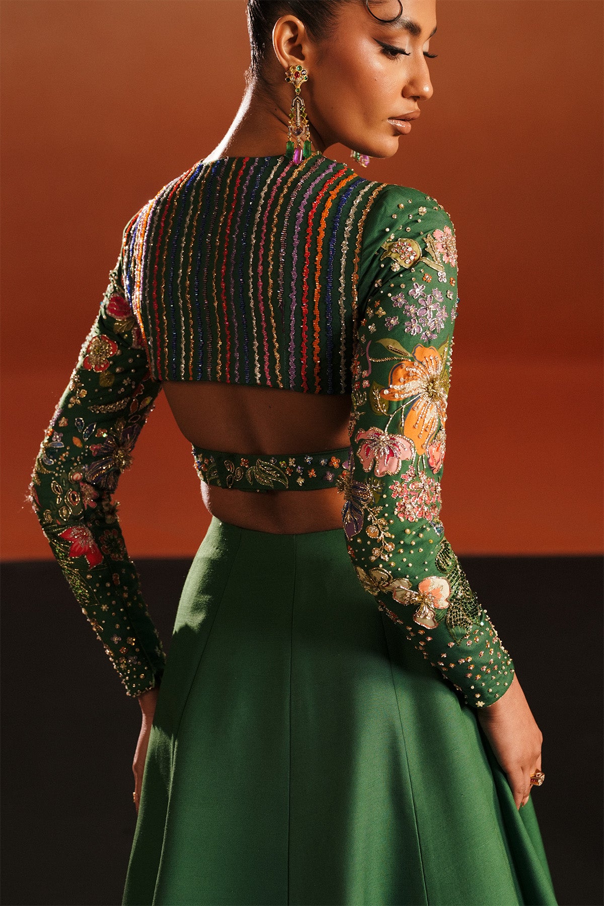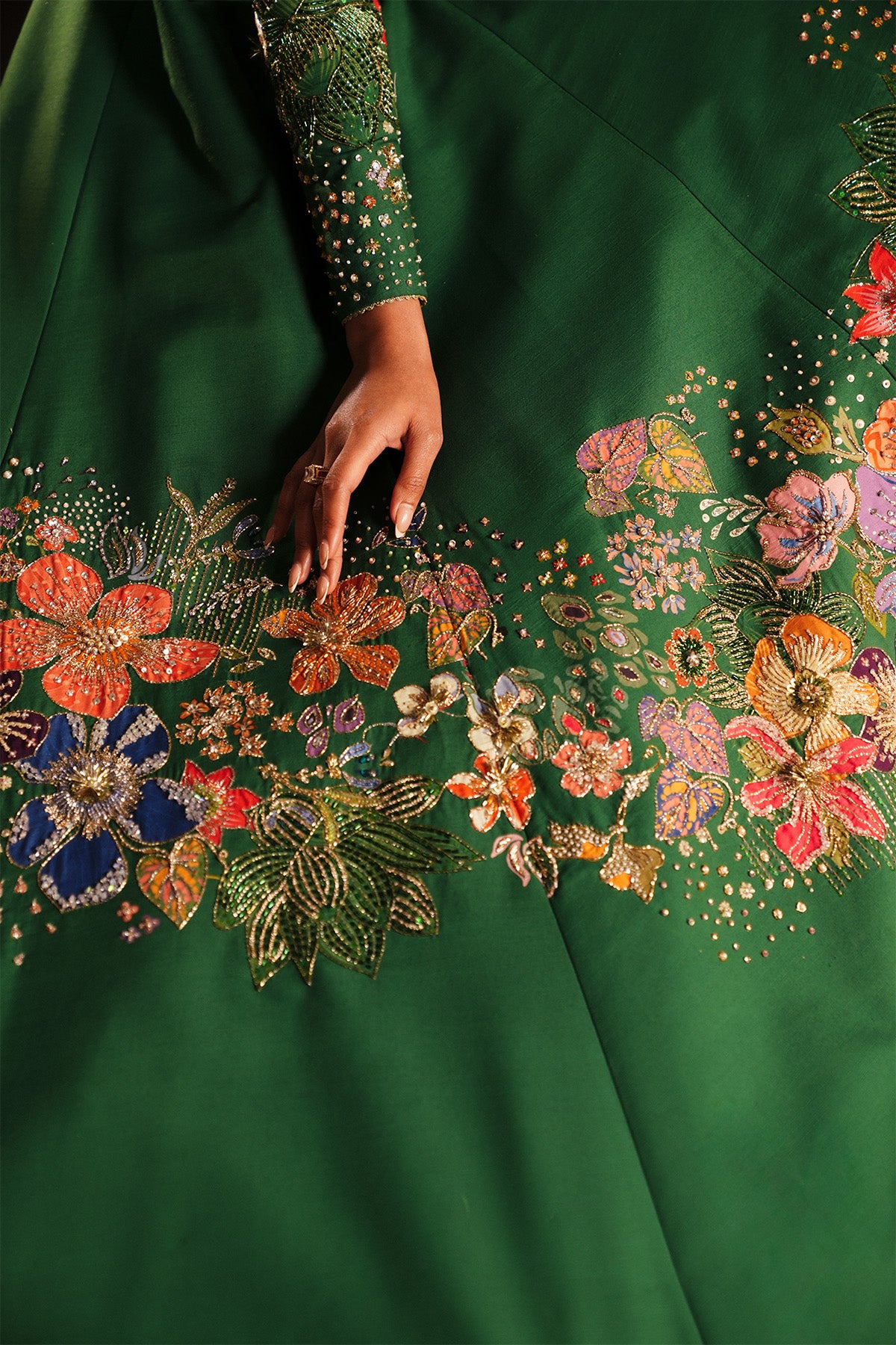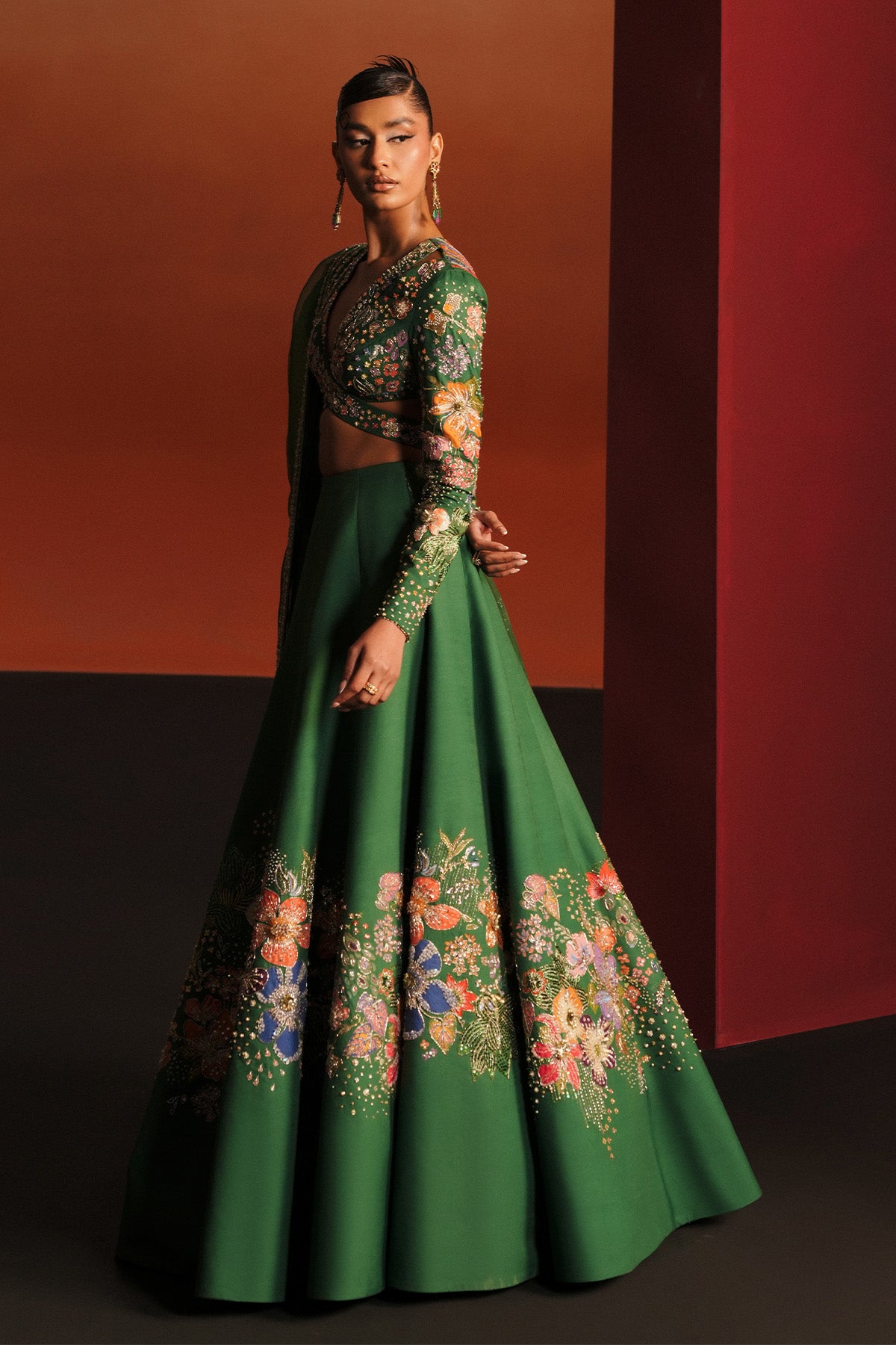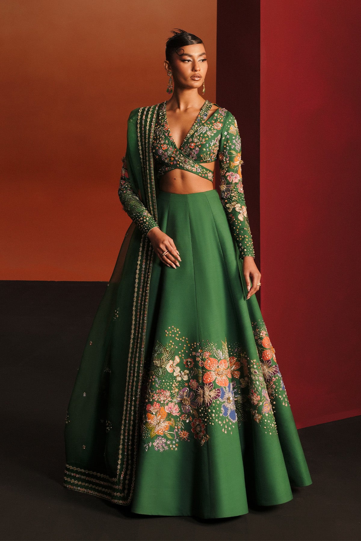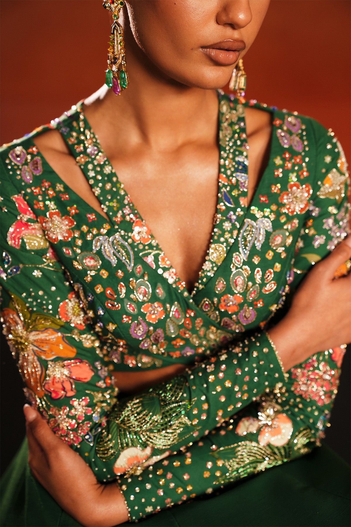 An emerald raw silk ensemble featuring a cross-over choli with fitted sleeves, delicately accented with bursts of colored embroidery.