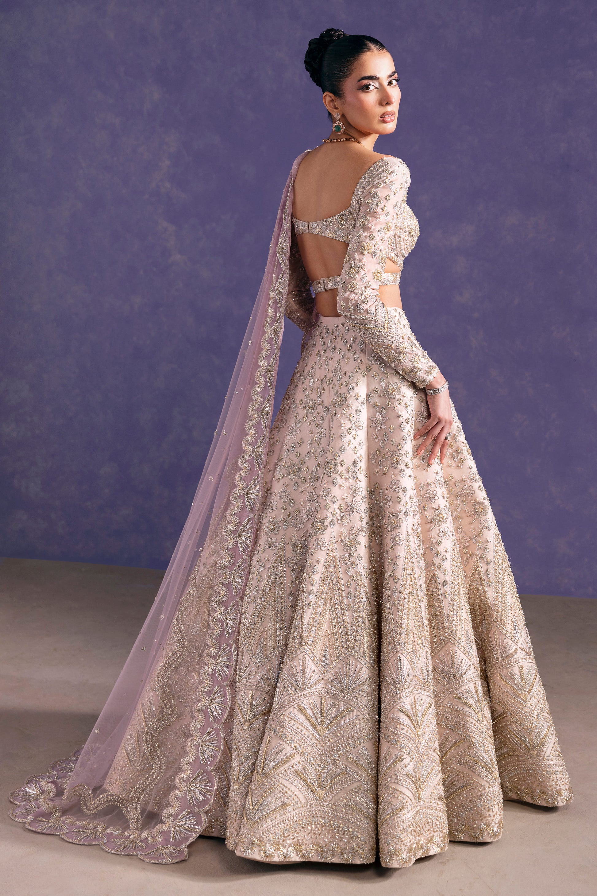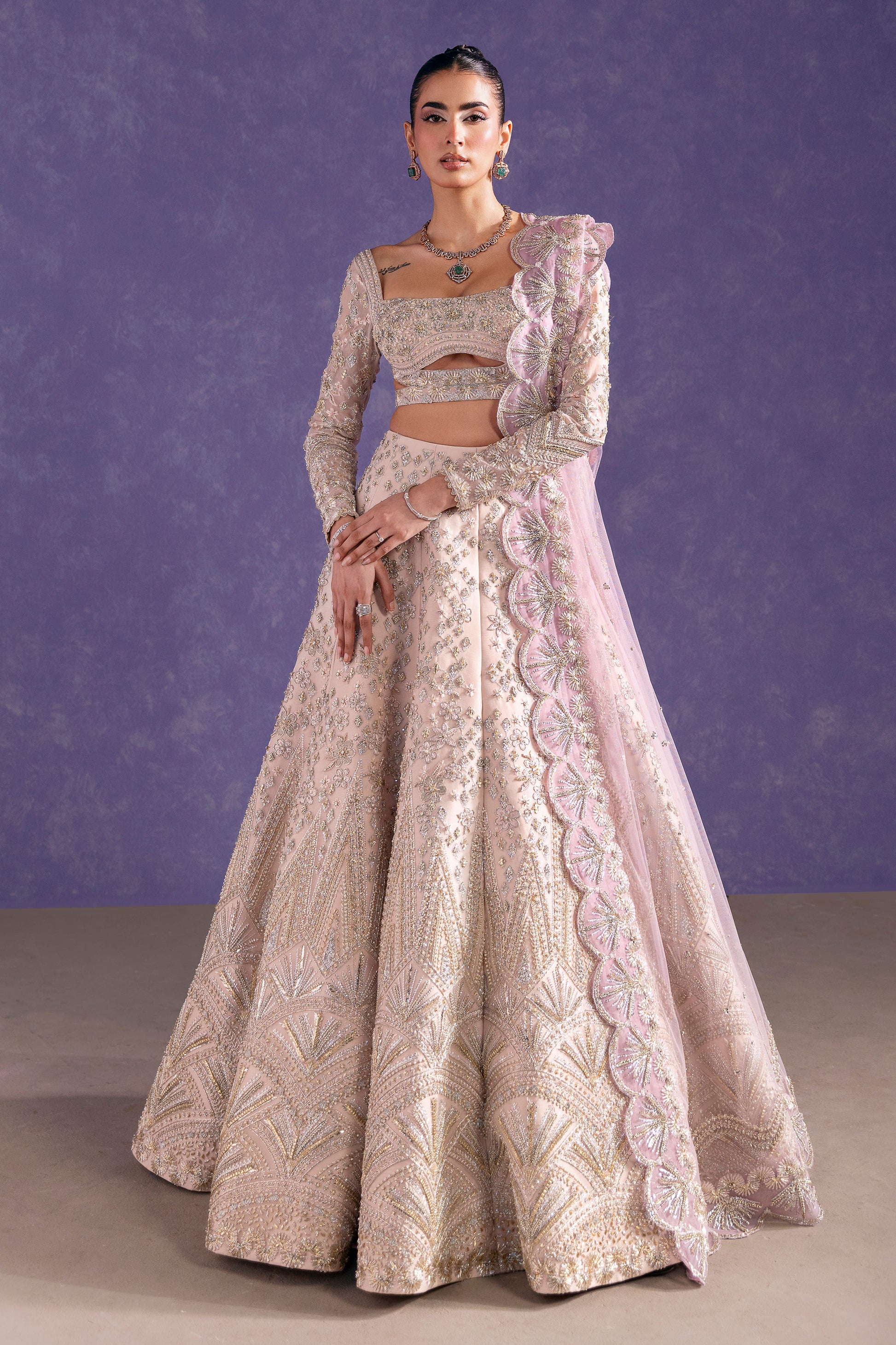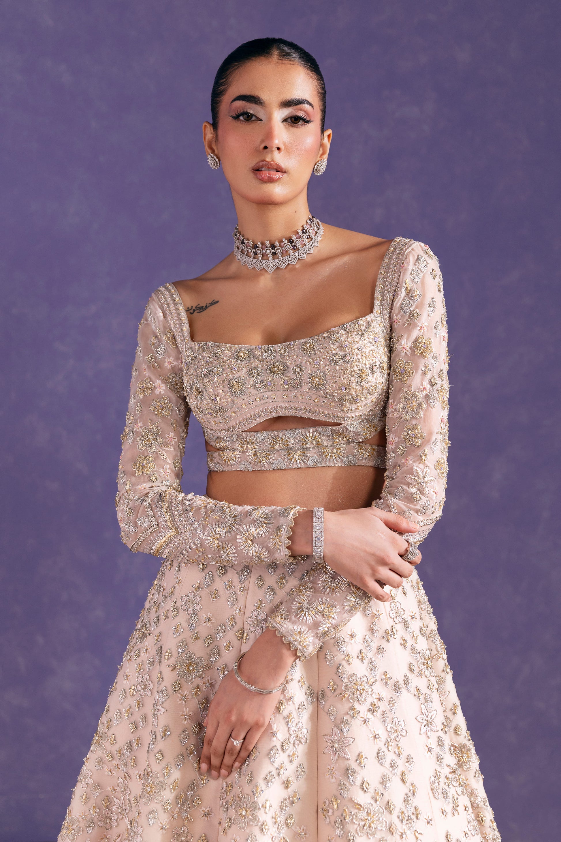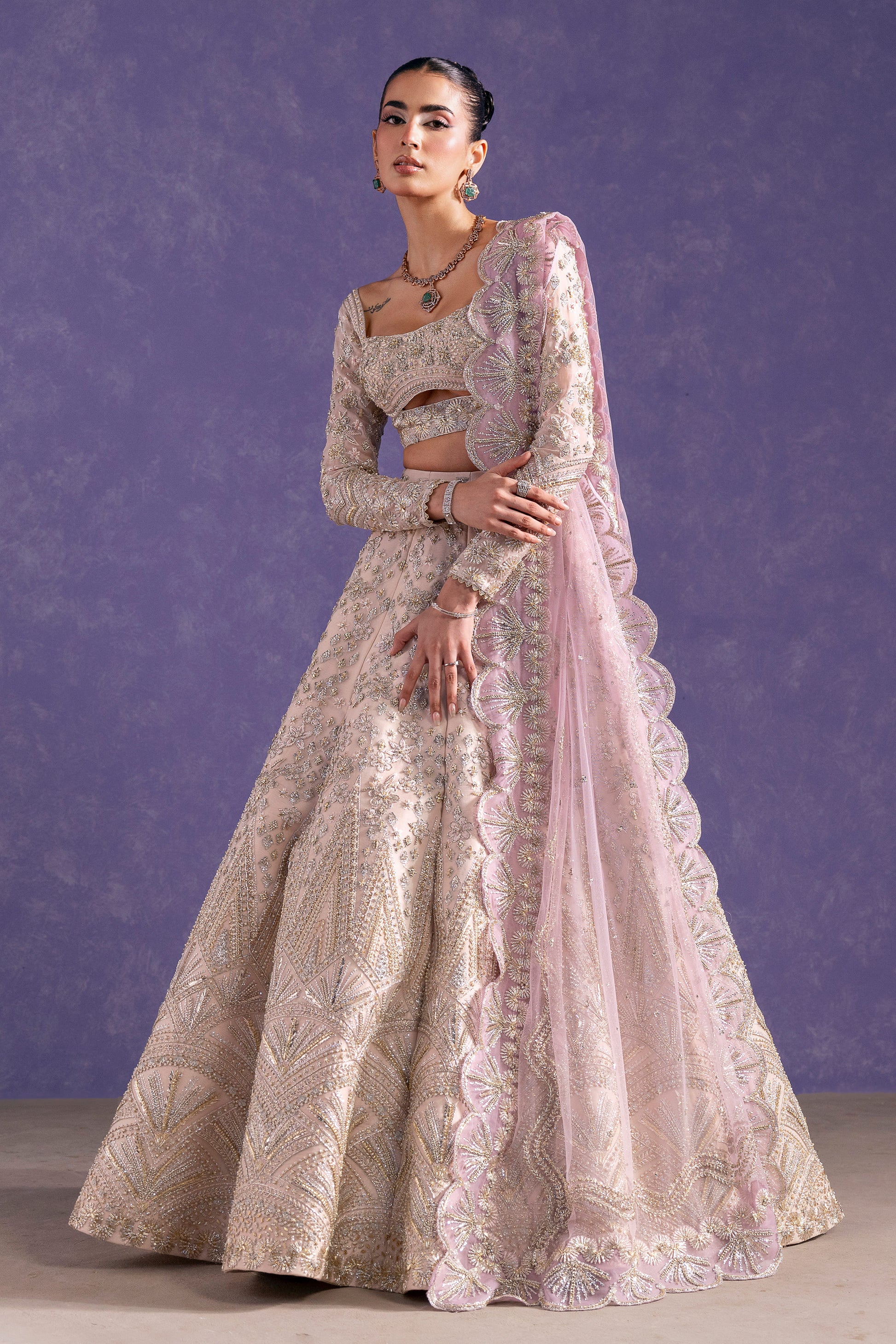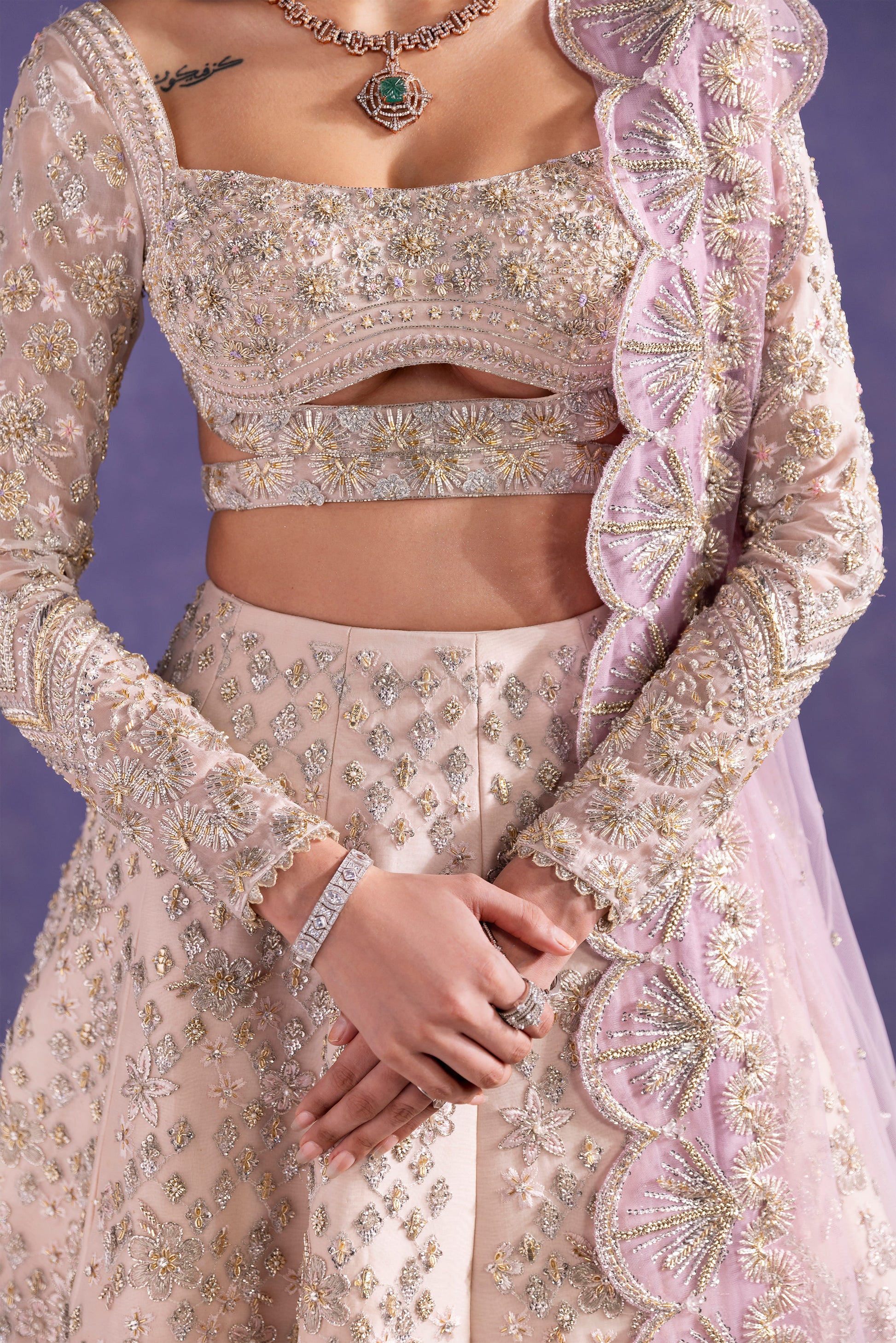 The peshwas, relaxed yet voluminous, radiates festivity while flattering with effortless grace, and the net dupatta, bordered with intricate opulence and scattered with a delicate chan, completes the symphony of bridal brilliance. The ensemble “where gold whispers, silver answers, and together, they shape a bride’s grandeur.