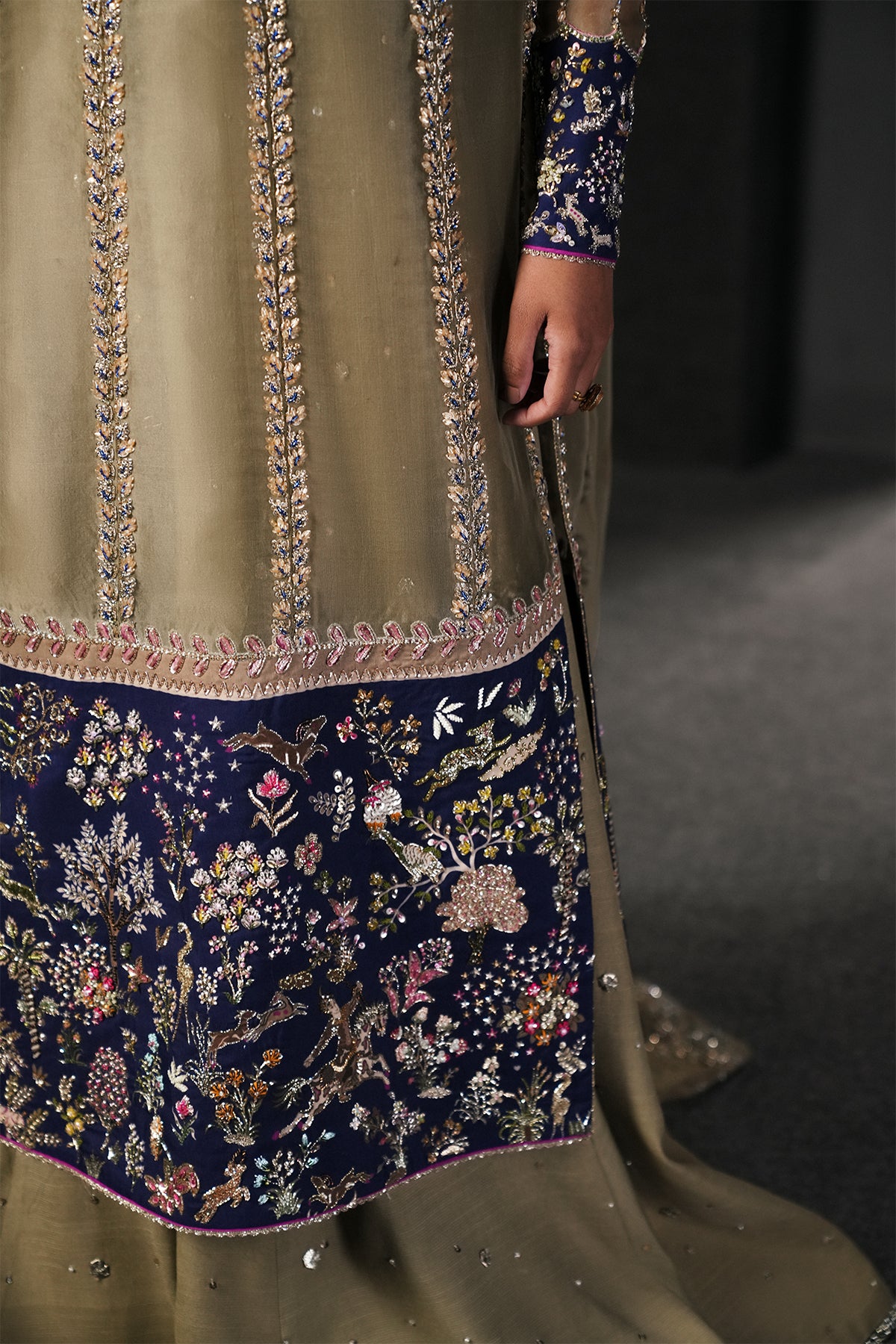 This contemporary ensemble features a straight-cut organza shirt with linear embroidery and a Mughal-inspired shikargah border.