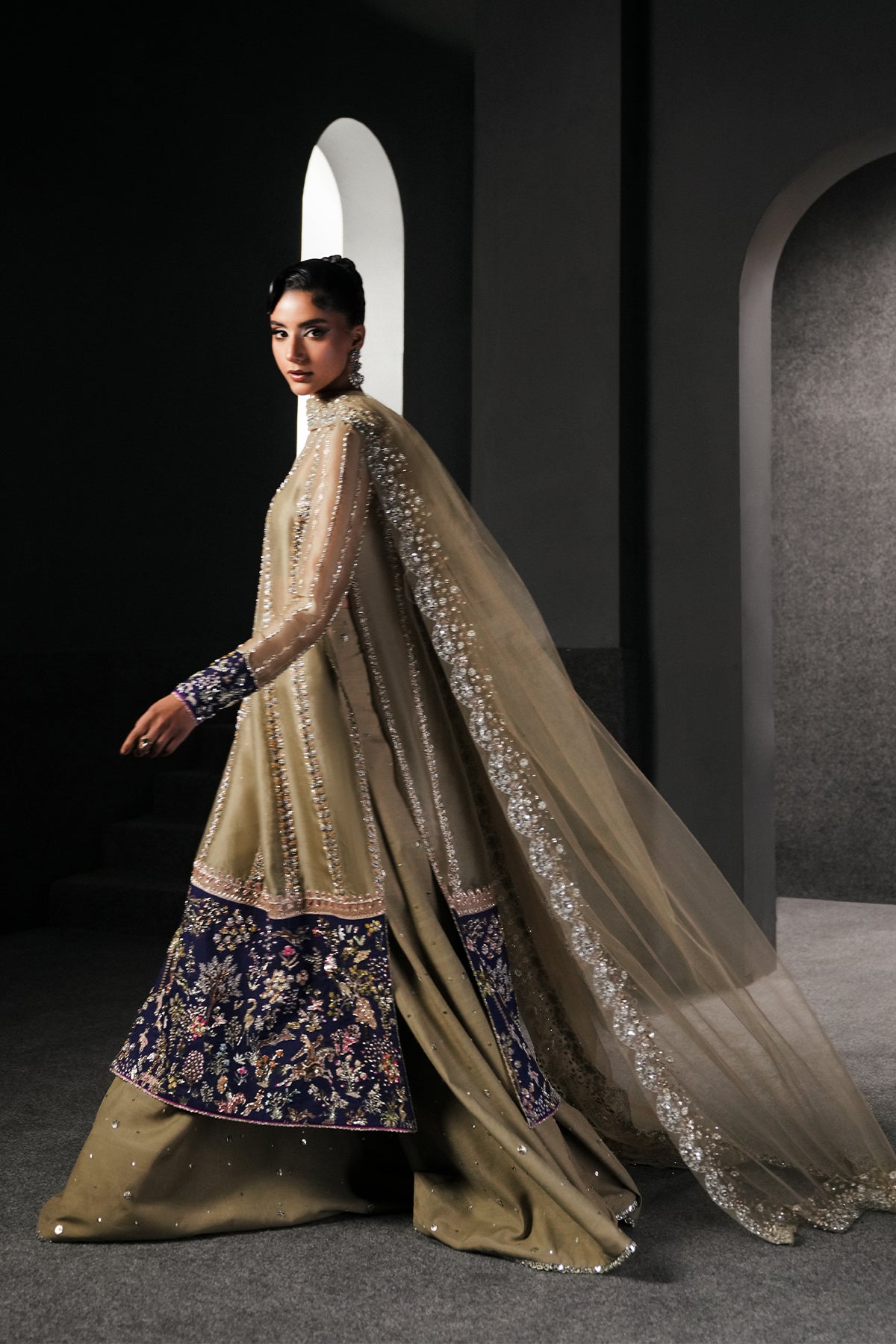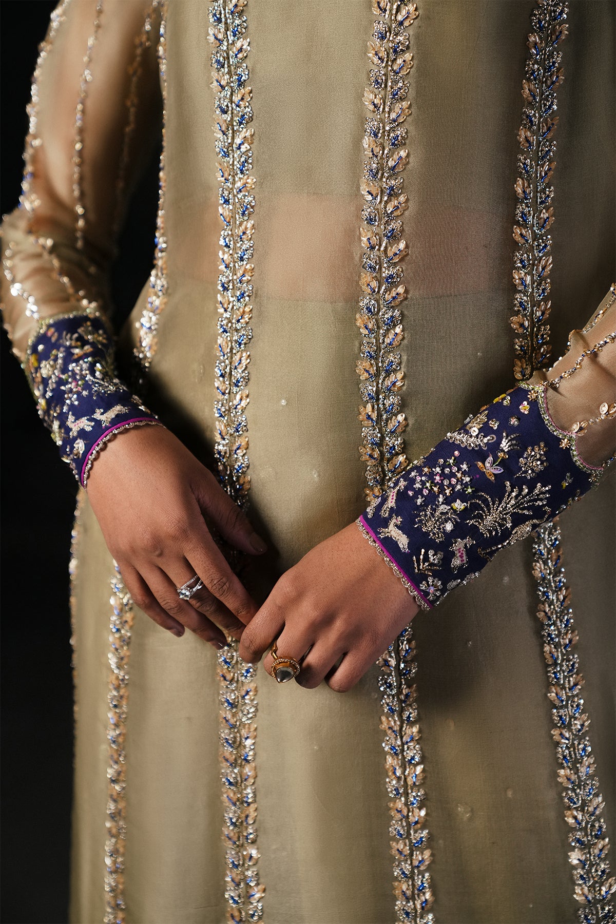 Paired with flowing raw silk pants accented with subtle motifs and a sheer net dupatta, it blends heritage-inspired detail with modern elegance for a refined, luxurious look.