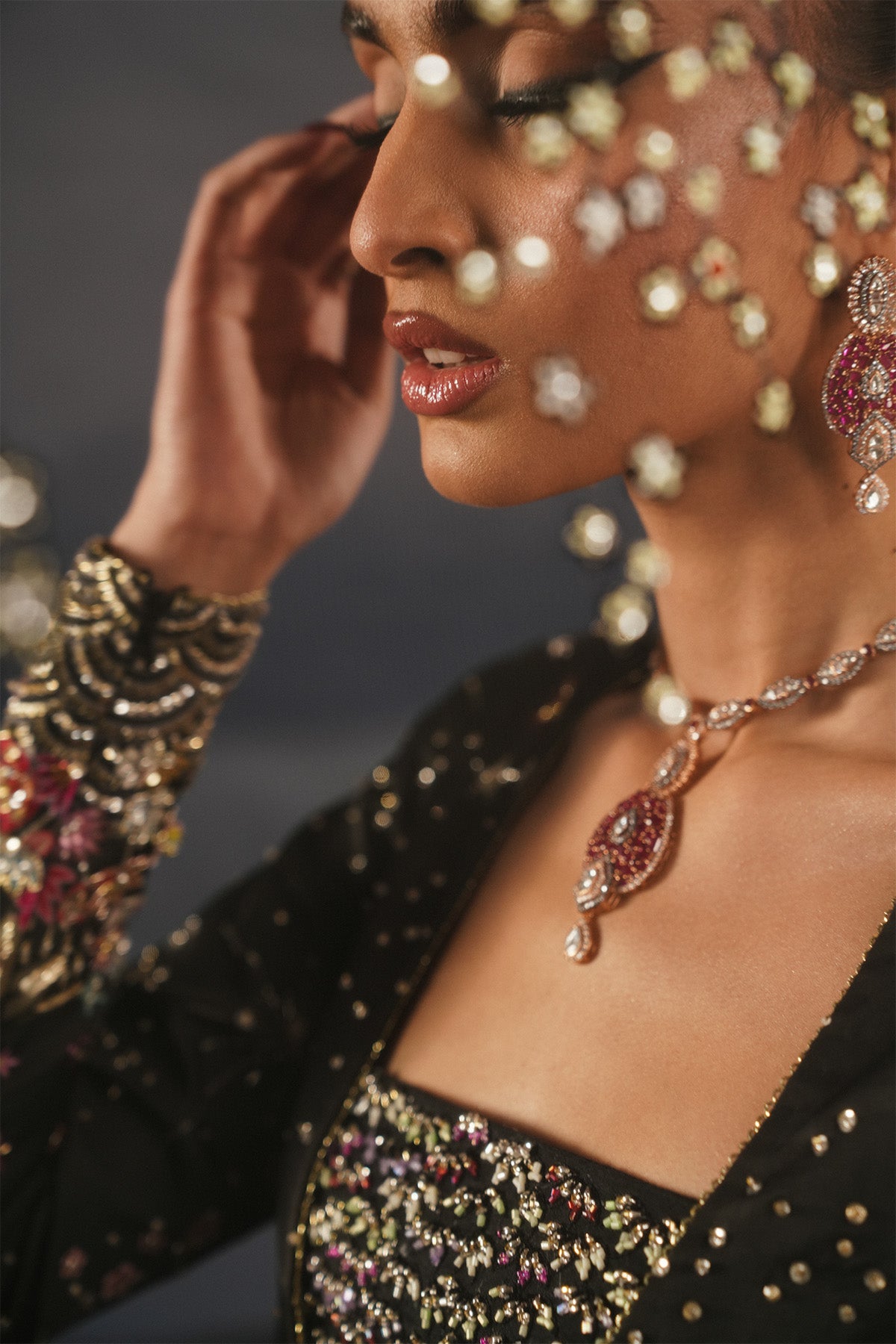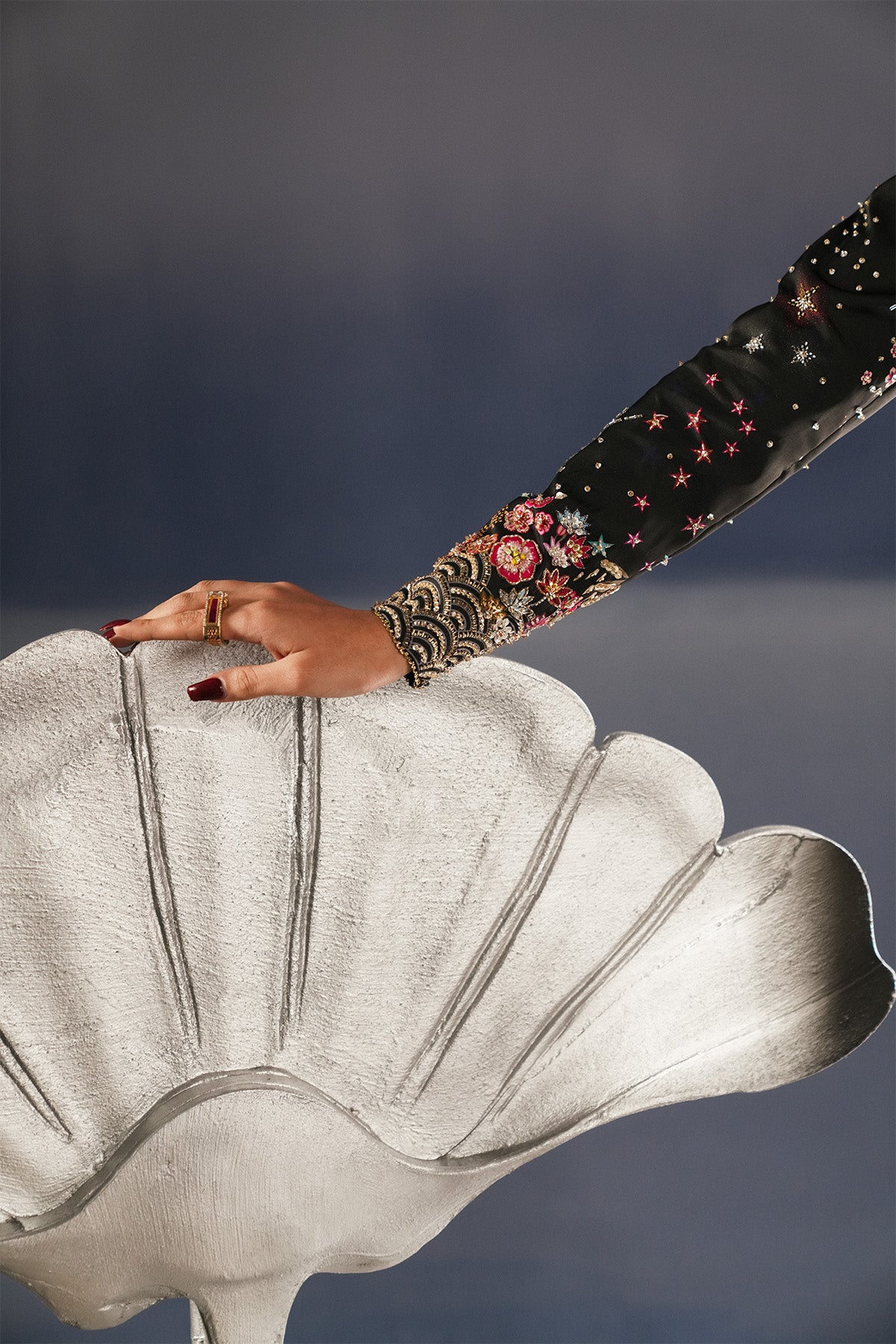 Draped in midnight elegance, this five panelled black silk formal dress flows with sculptural grace and refined movement.
