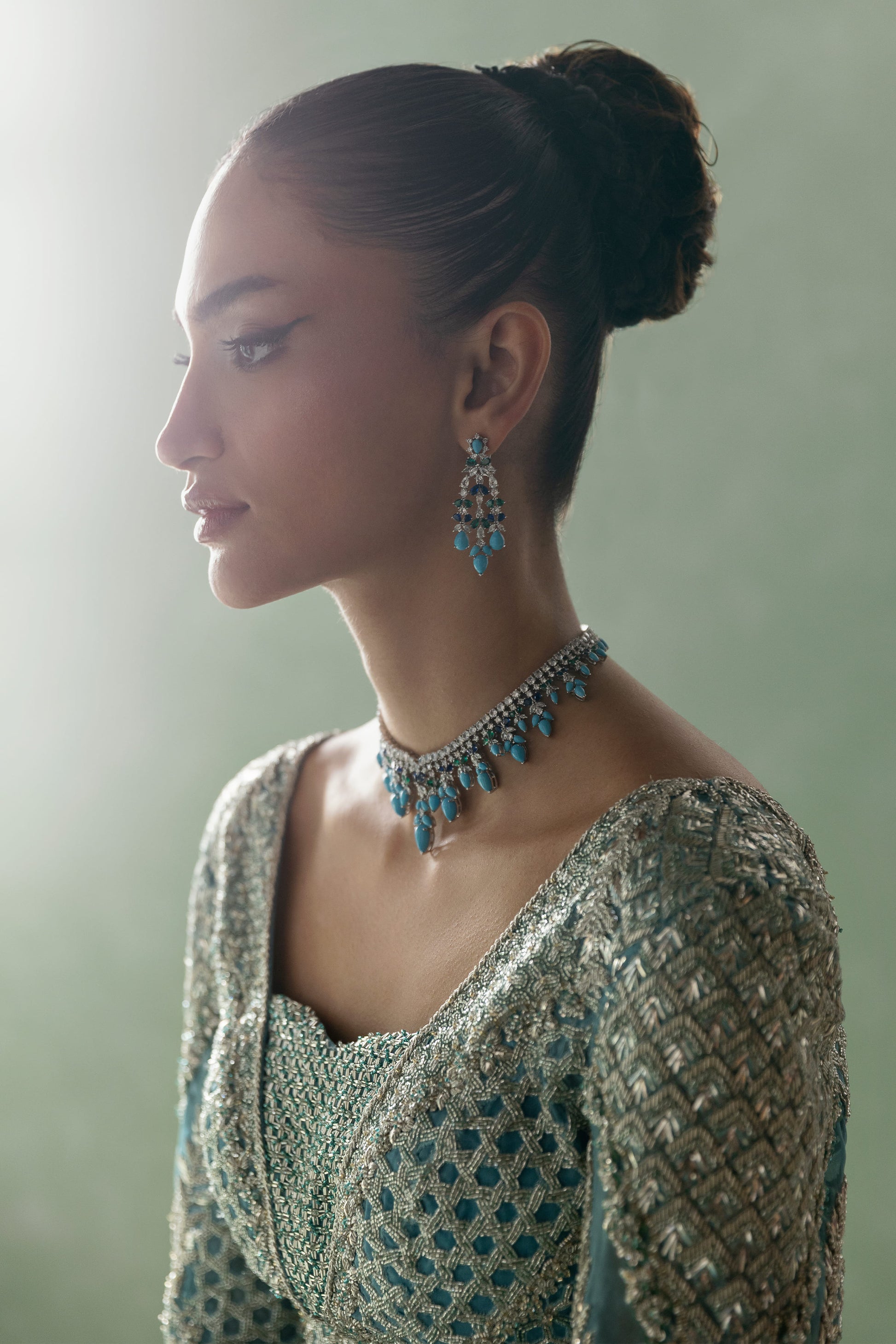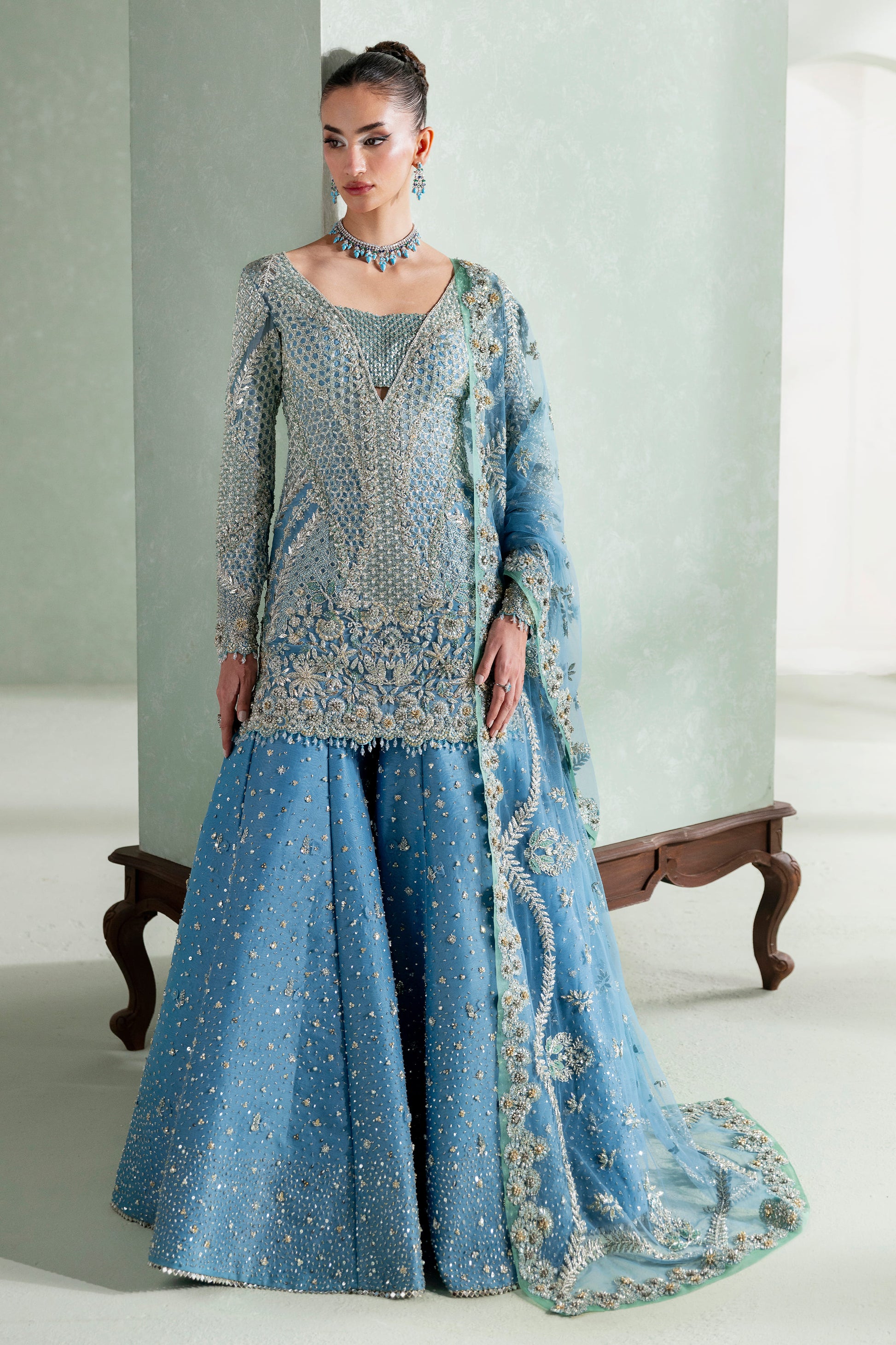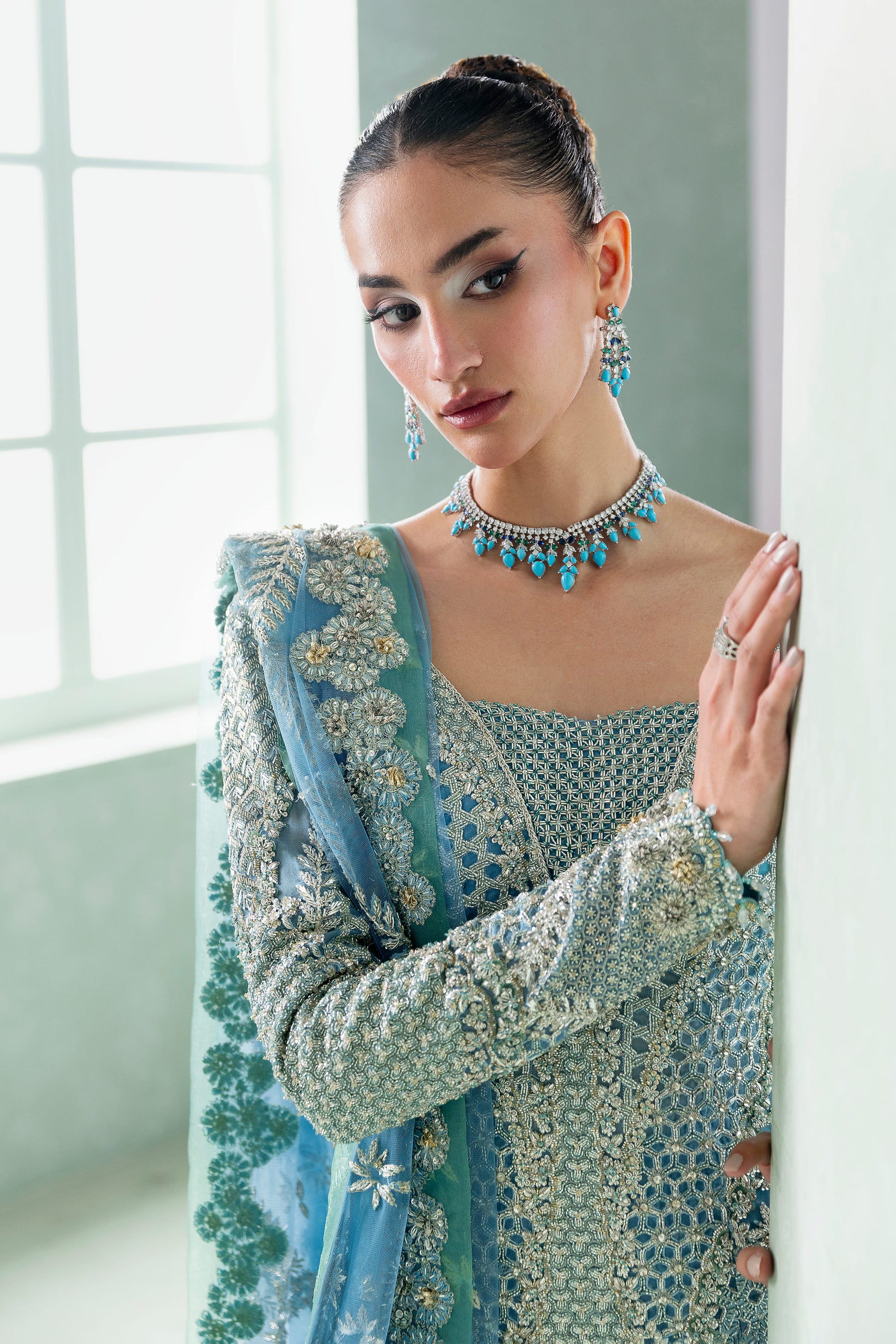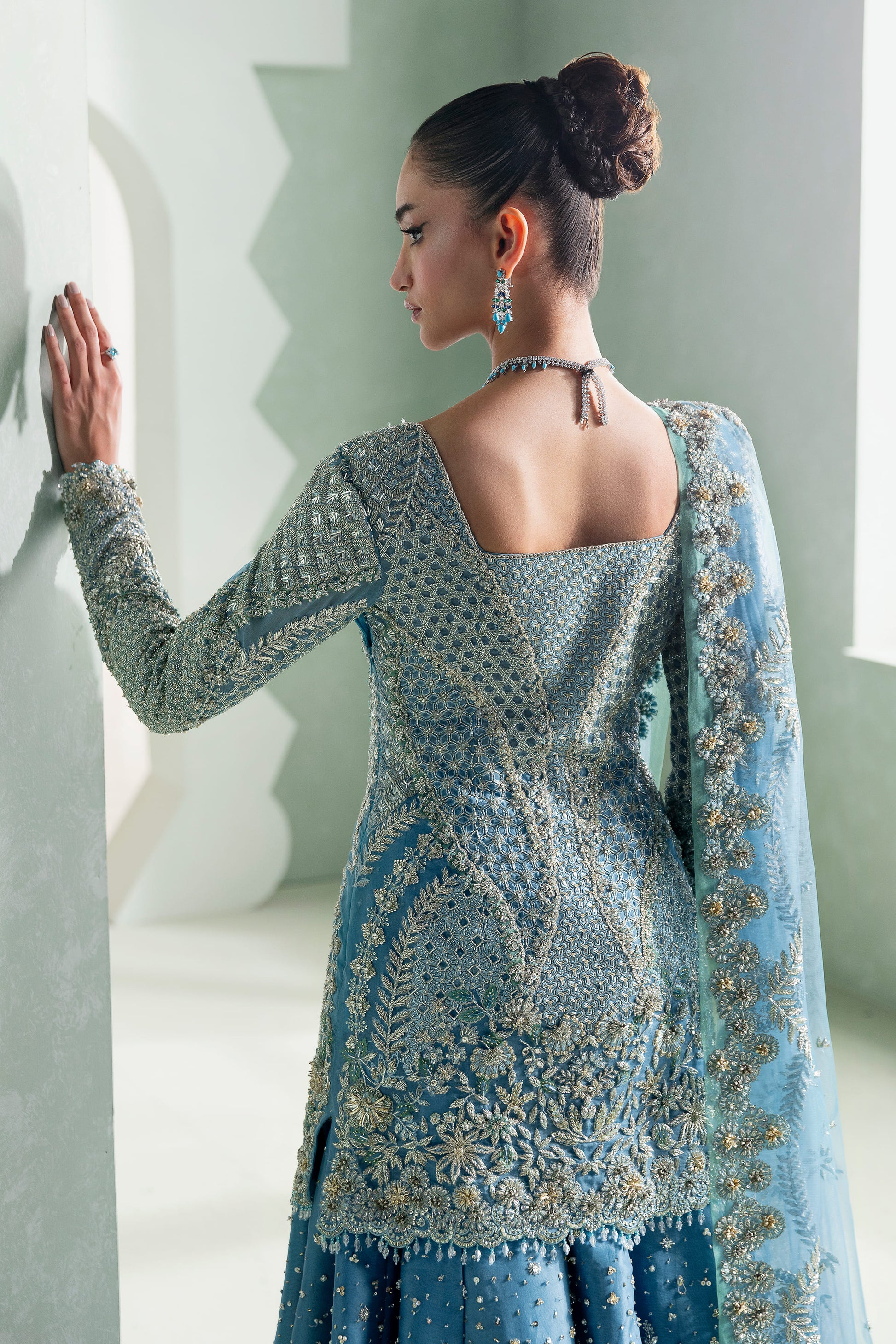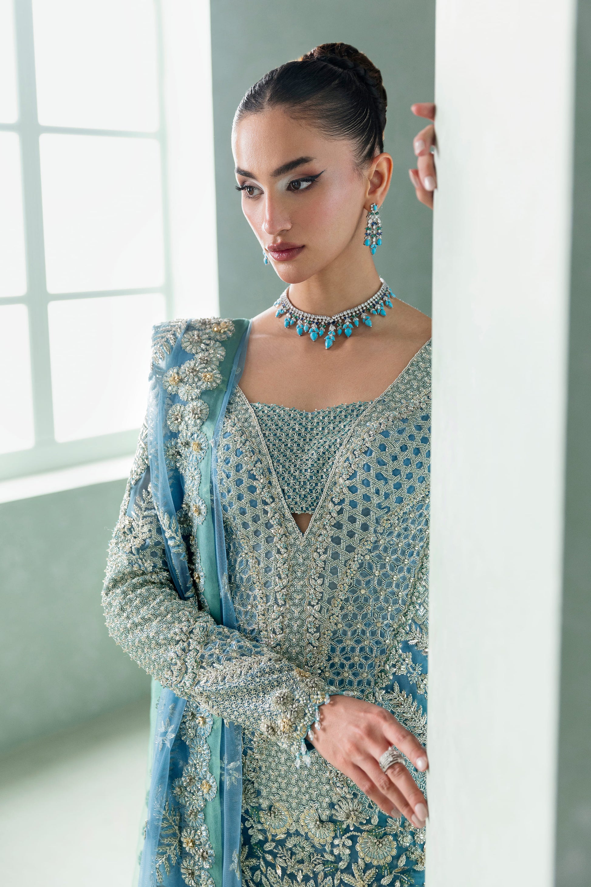 Drenched in Columbia blue, Rigel is a metamorphic ensemble that glides seamlessly across occasions”— from the intimacy of a nikkah to the grandeur of a reception. The shirt is orchestrated with intersecting tartan grids, where opulent florals unfurl in layers of zardozi and contemporary couture craftsmanship. Seafoam green accents ripple along the edges, framing the silhouette with refined contrast.