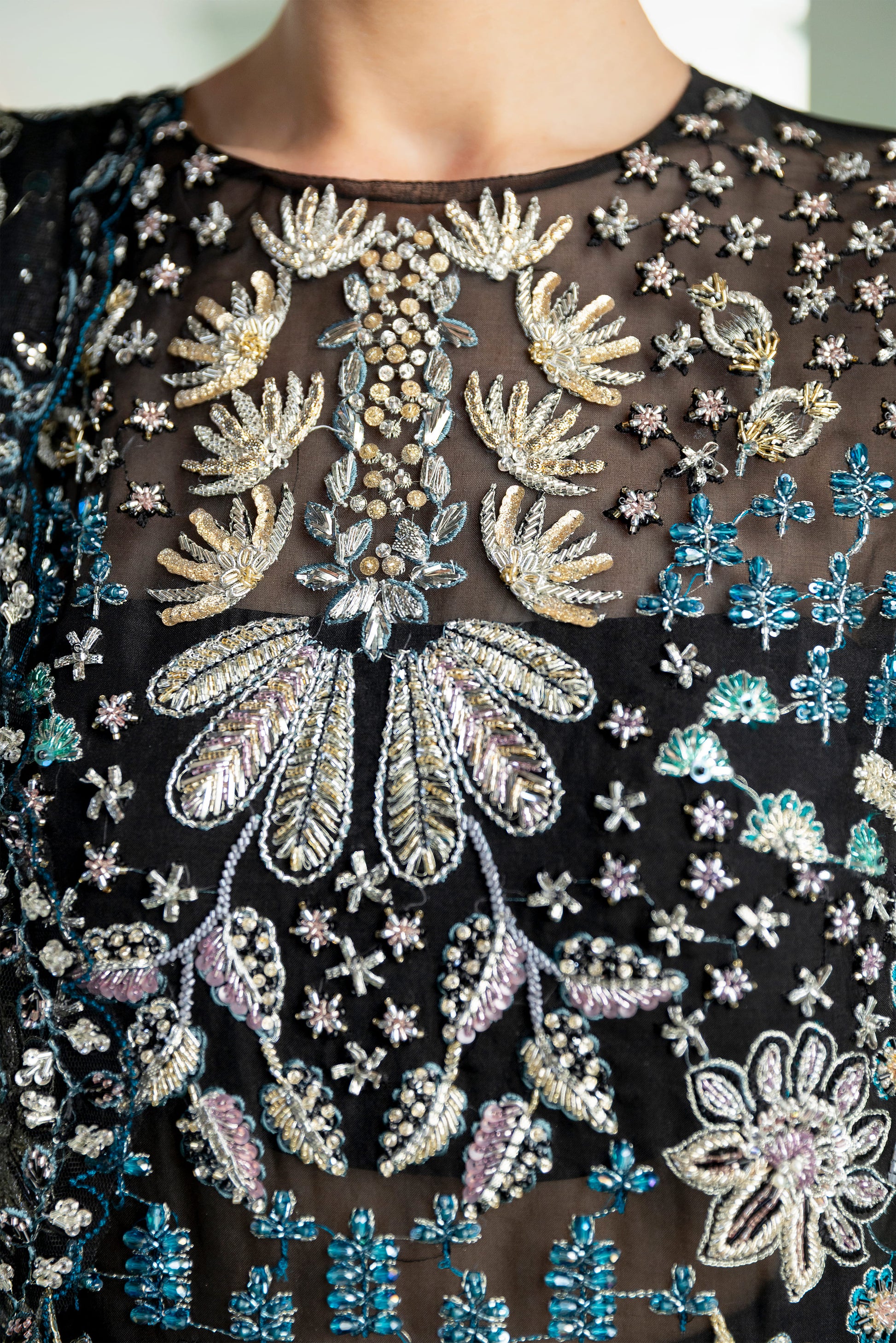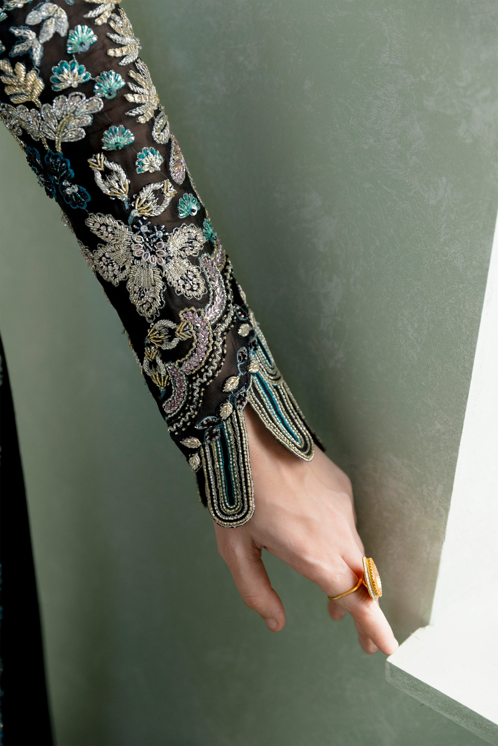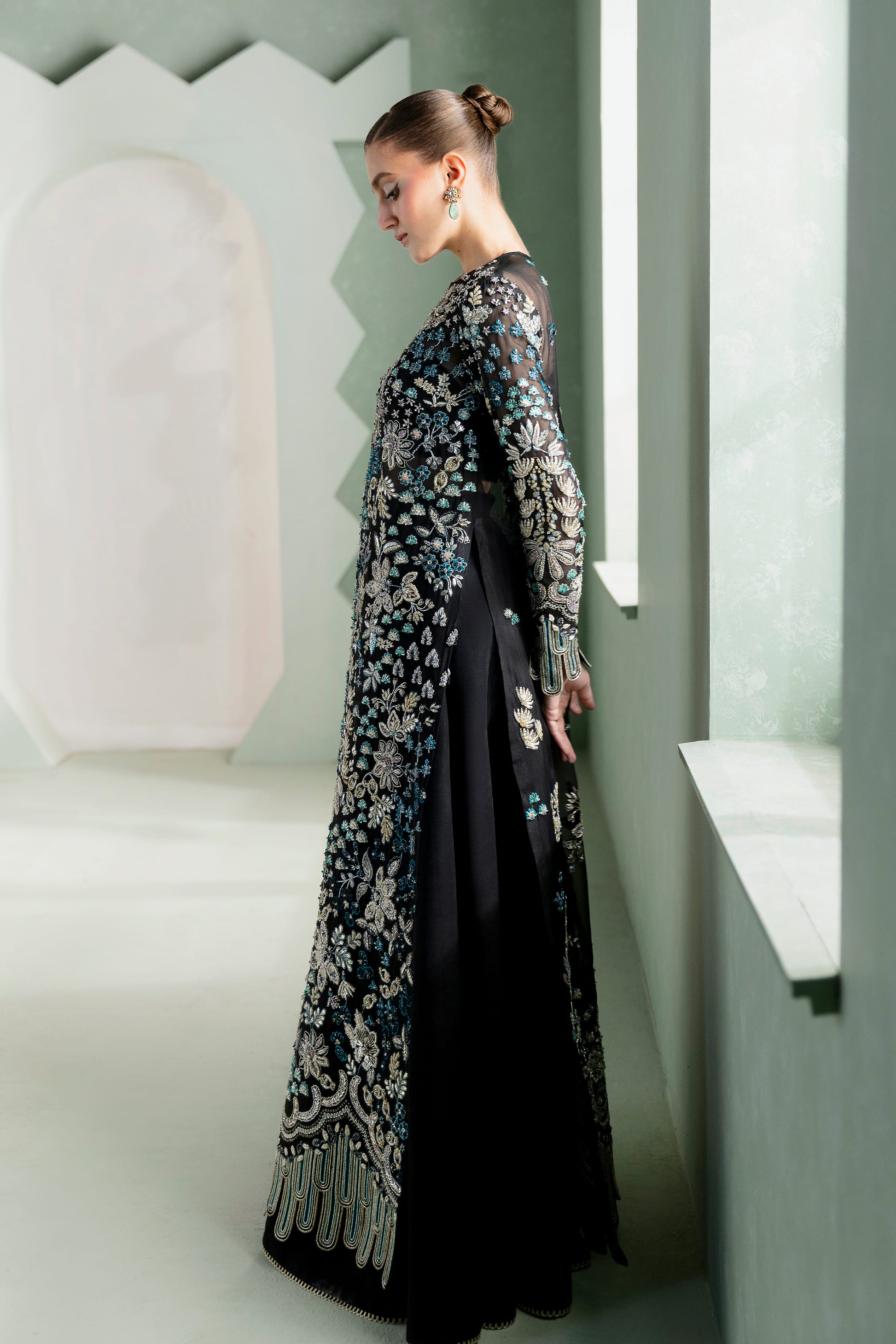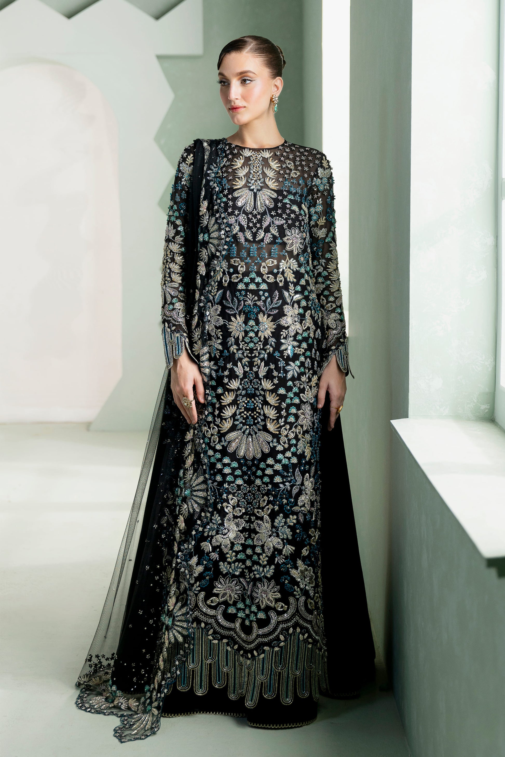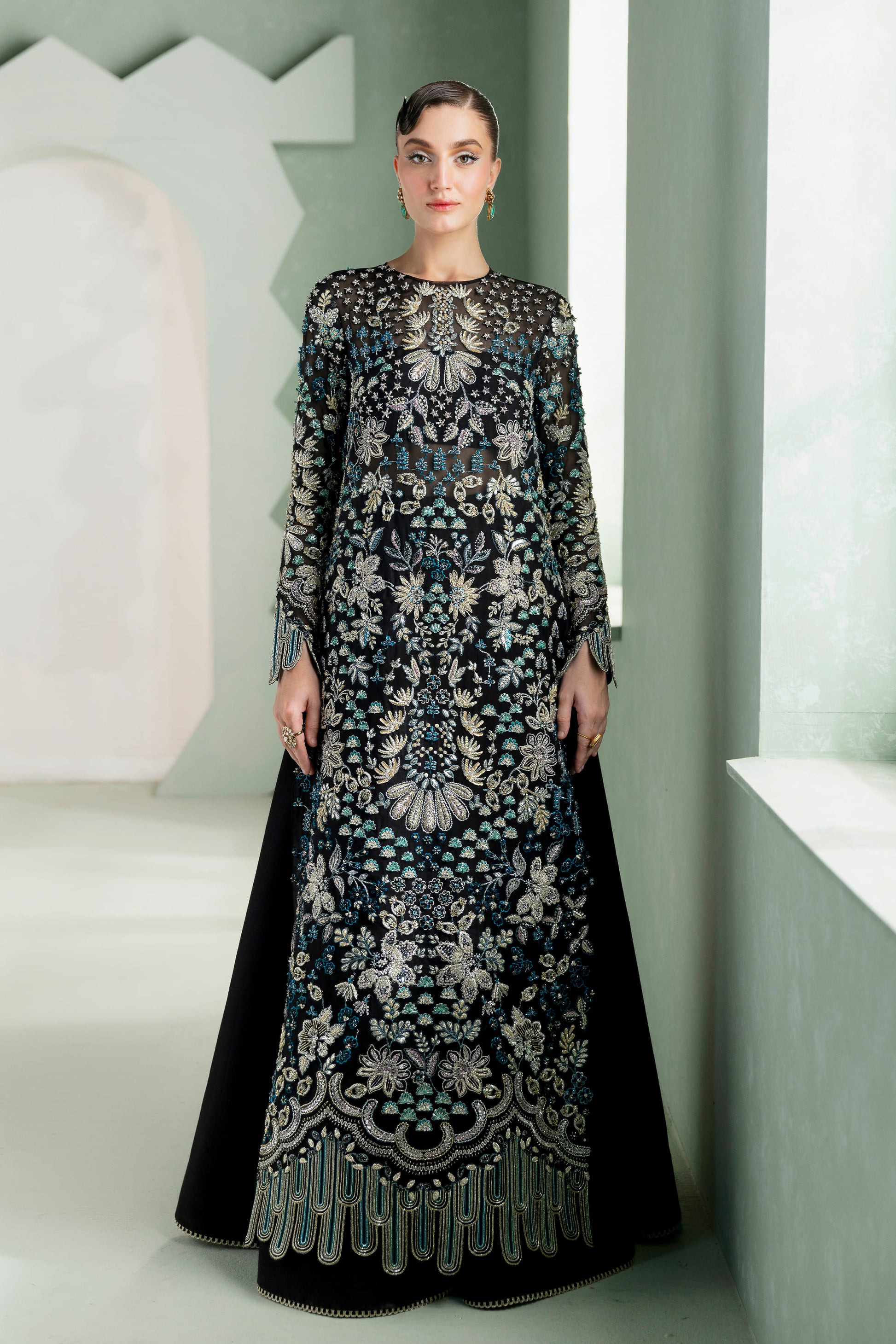 Adorned with meticulous makesh, naqshi, dabka, zardozi, and iridescent crystals, the ensemble flourishes in an opulent textural rhythm — a dark fantasy exuberating the sheen of distant galaxies. The scalloped hemline orchestrates symmetry and softness, balancing the grandeur of the shirt with architectural precision.