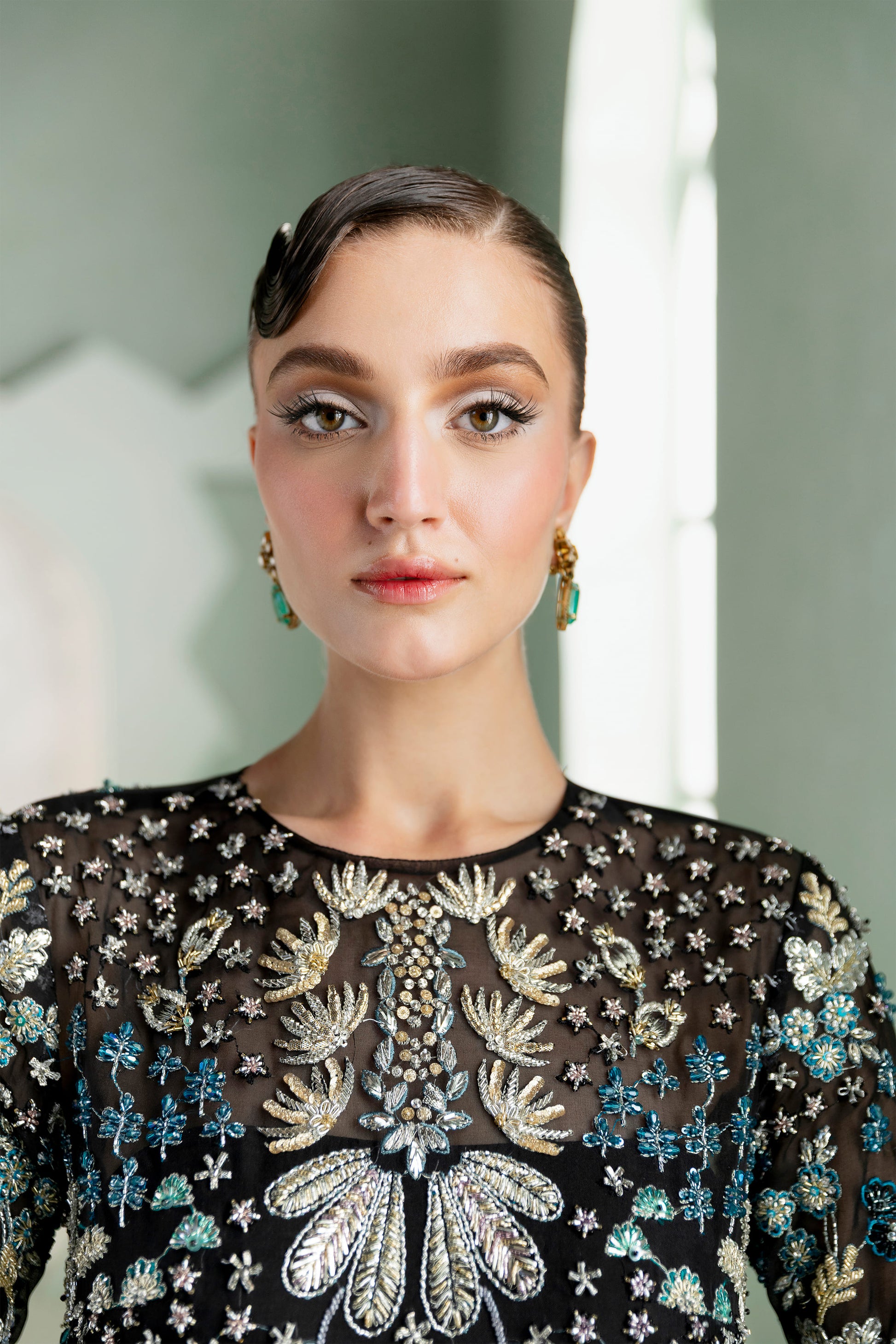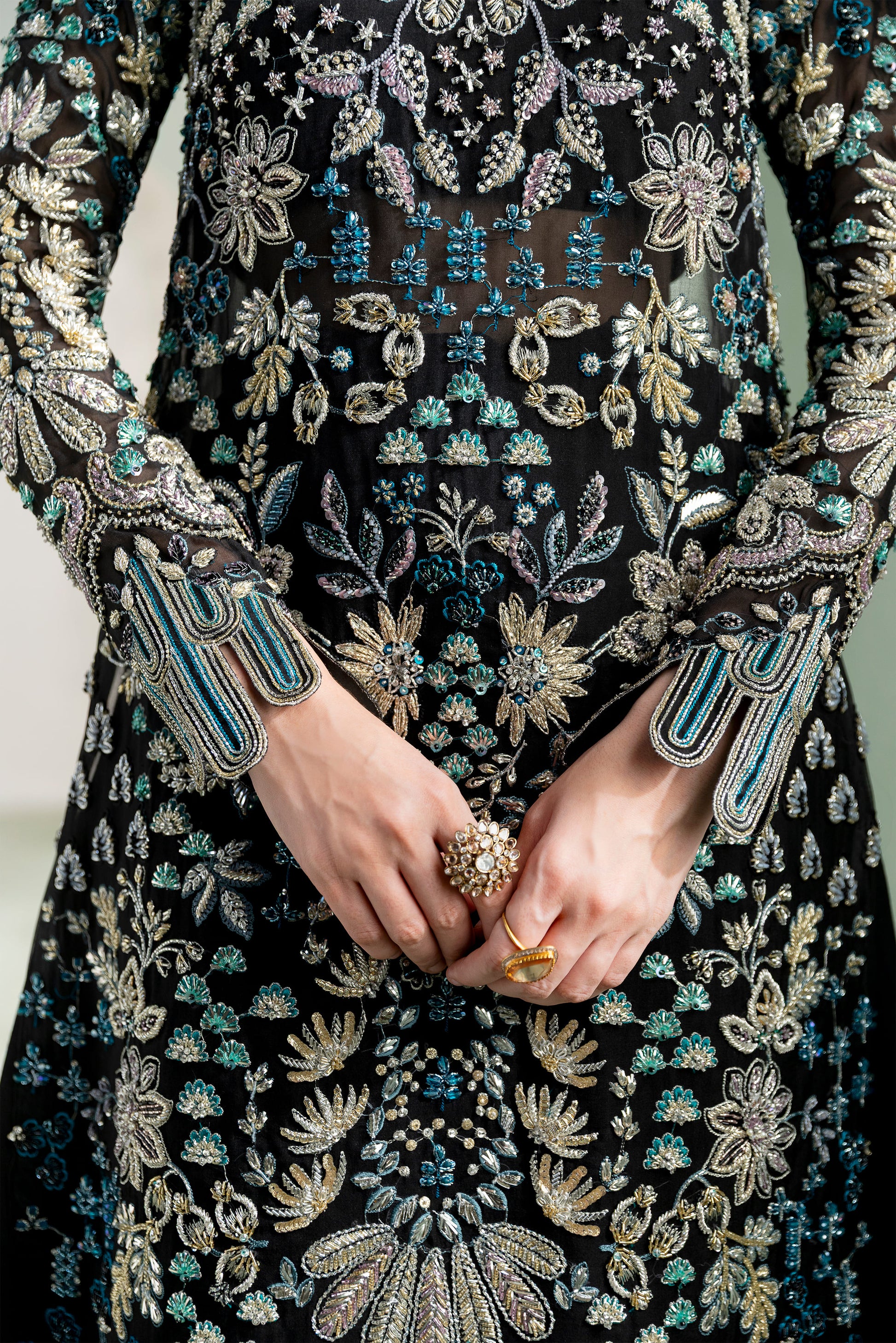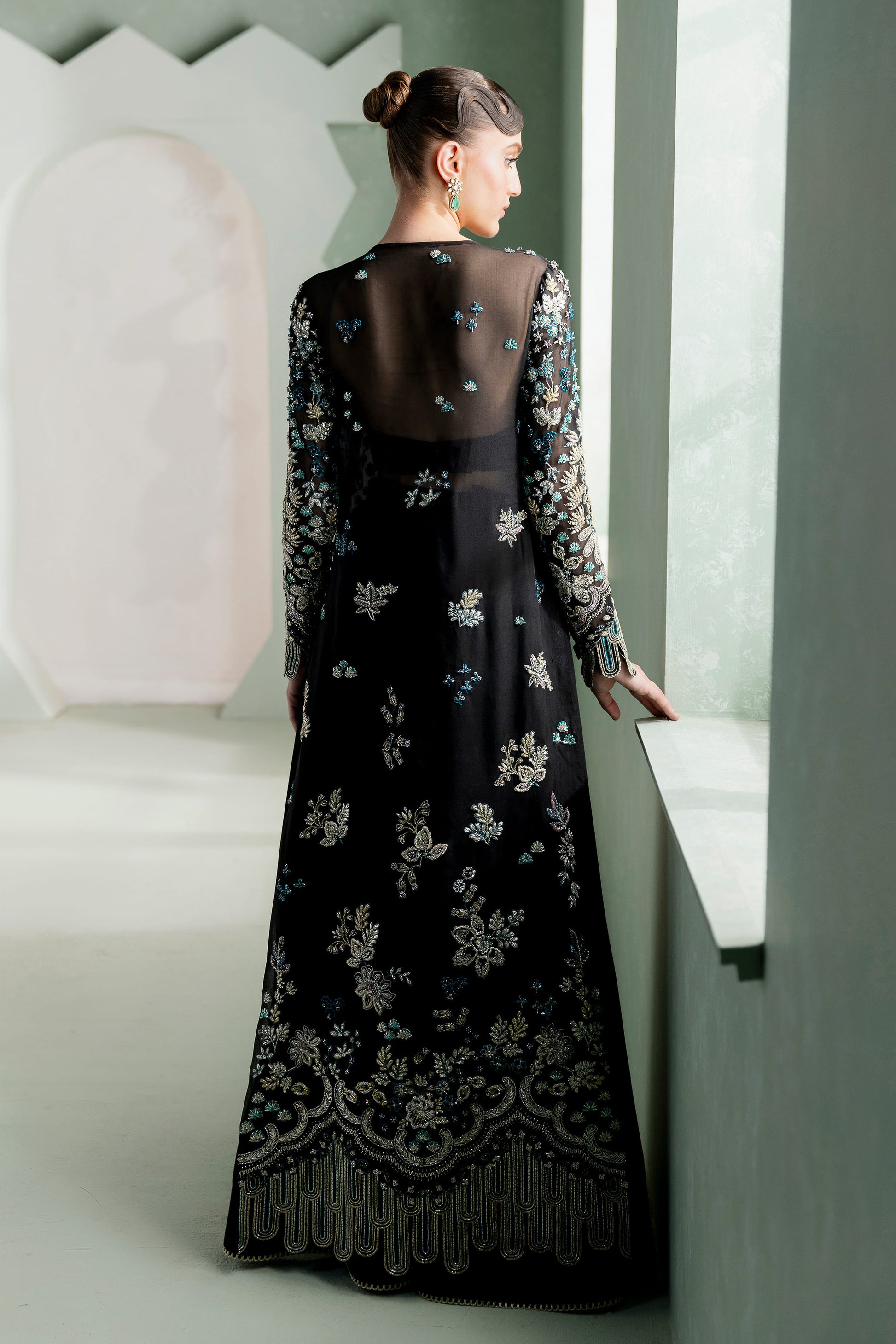 Draped in mystery and magnificence, Siyah is a black organza raiment that evokes the allure of flowers captured in moonlit stillness” — a visual reverie inspired by Billy Kidd’s nocturnal florography. The straight long shirt, a timeless silhouette, becomes a stage for crystallized artistry where jeweled blues and greens shimmer like dew on withering petals, translating discoloration into design language.