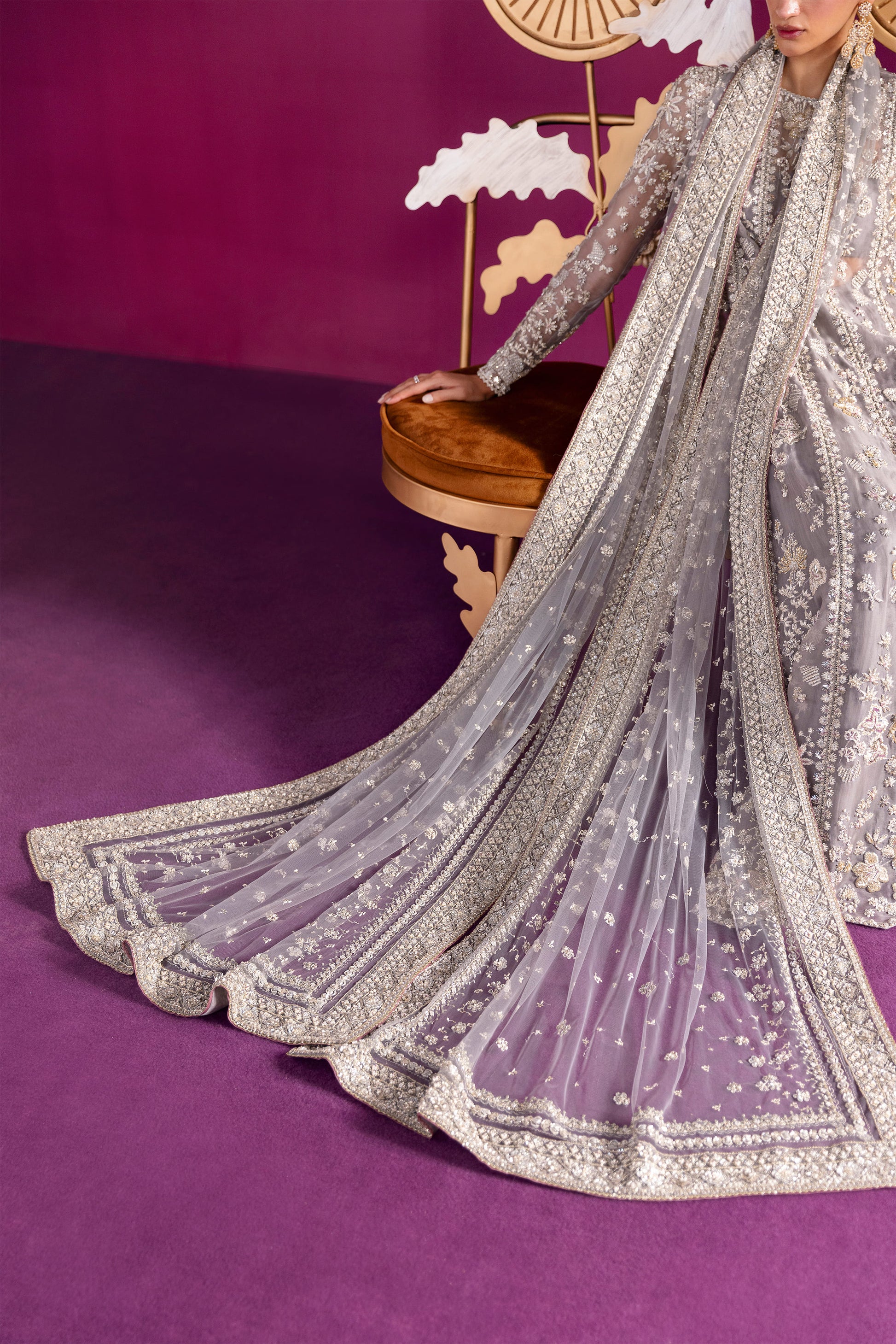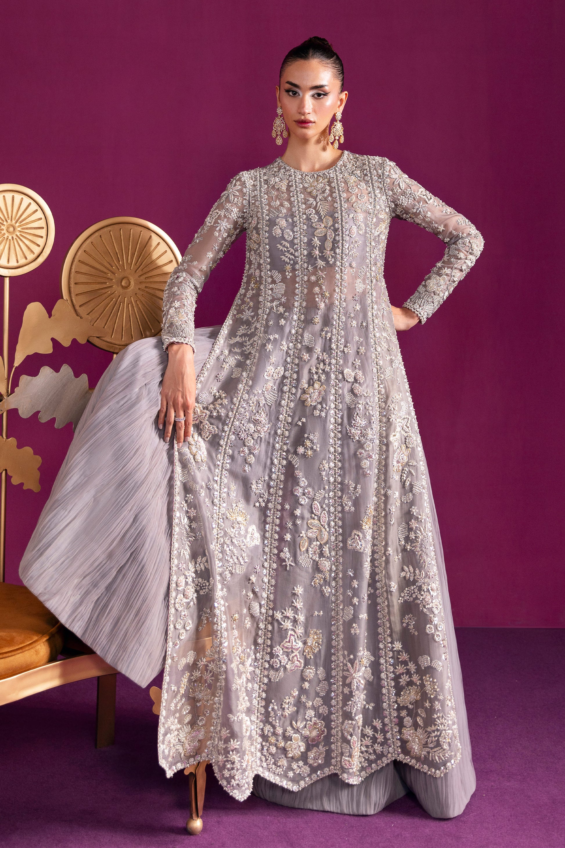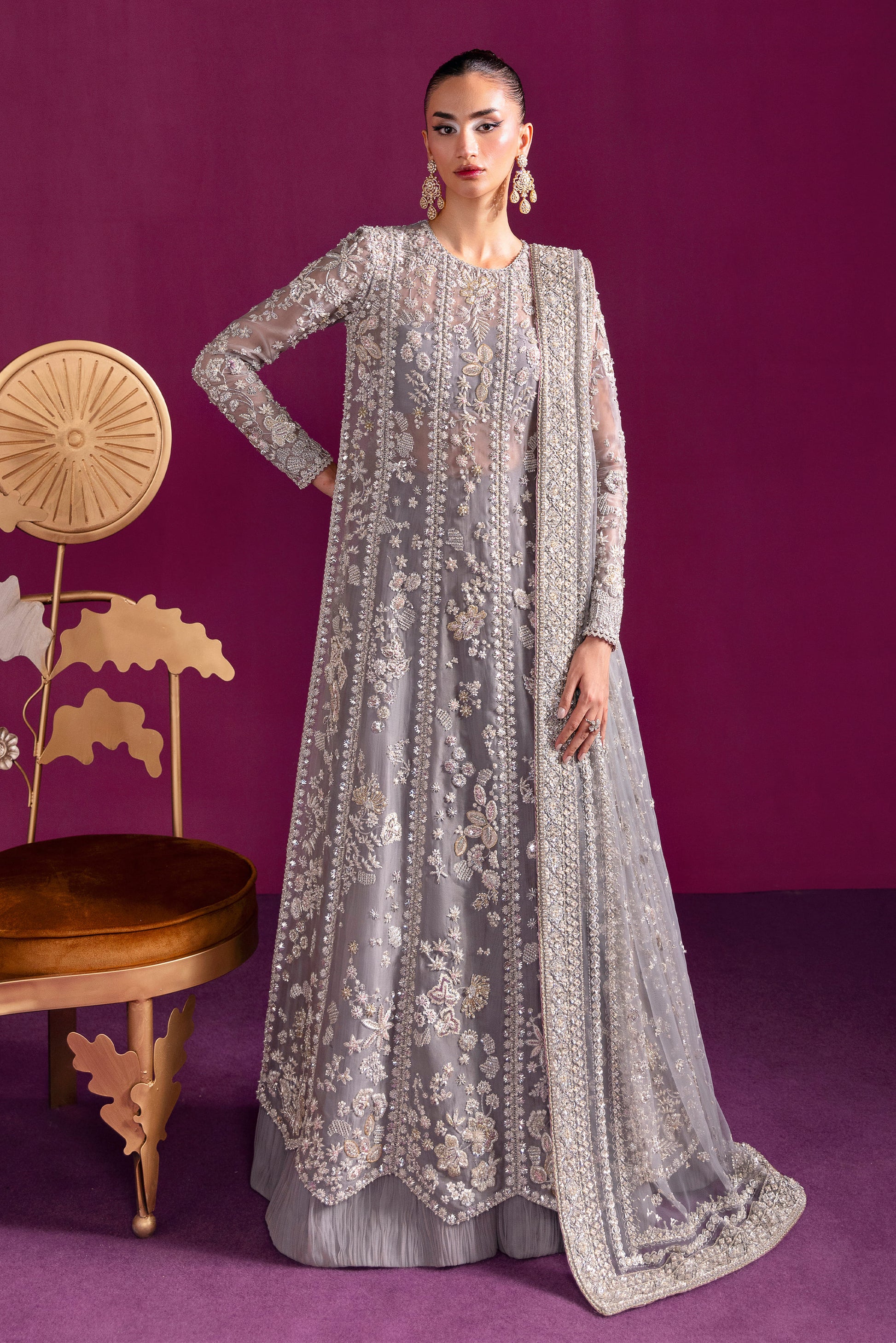 A lyrical canvas where artistry meets regality”. The ensemble blooms like a garden of flora and fauna, its misty grey base shimmering under silver dabka, nakshi, and a constellation of crystal-glass embellishments, delicately framed with makesh work.