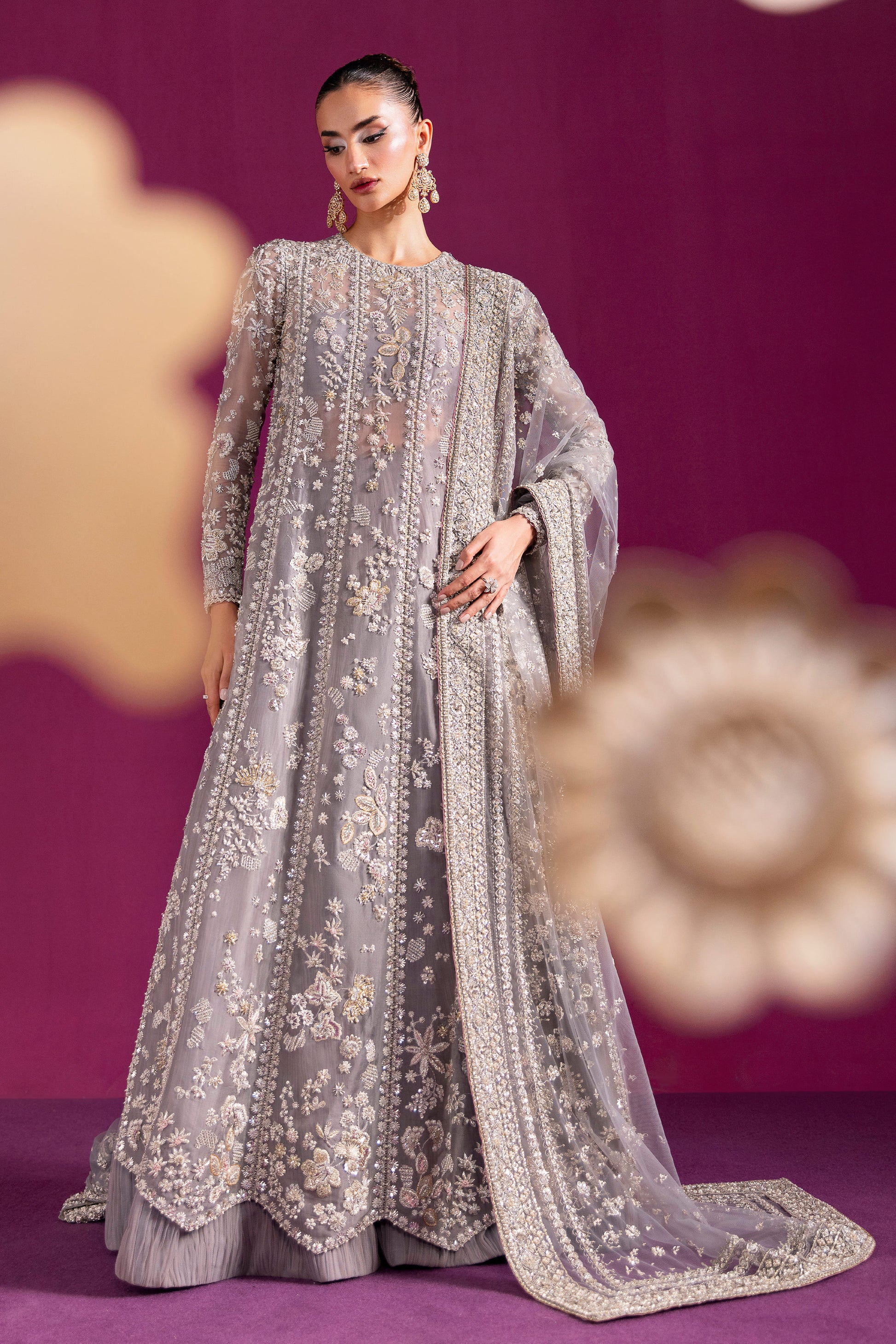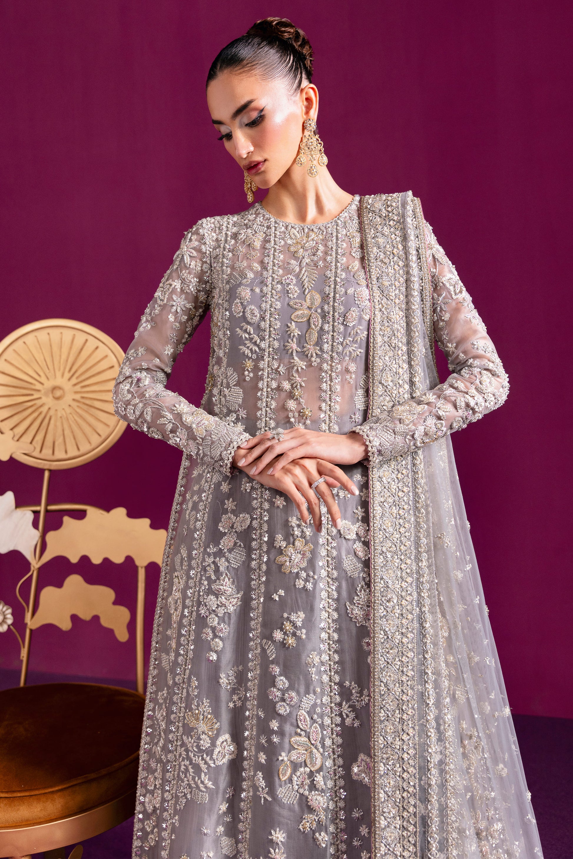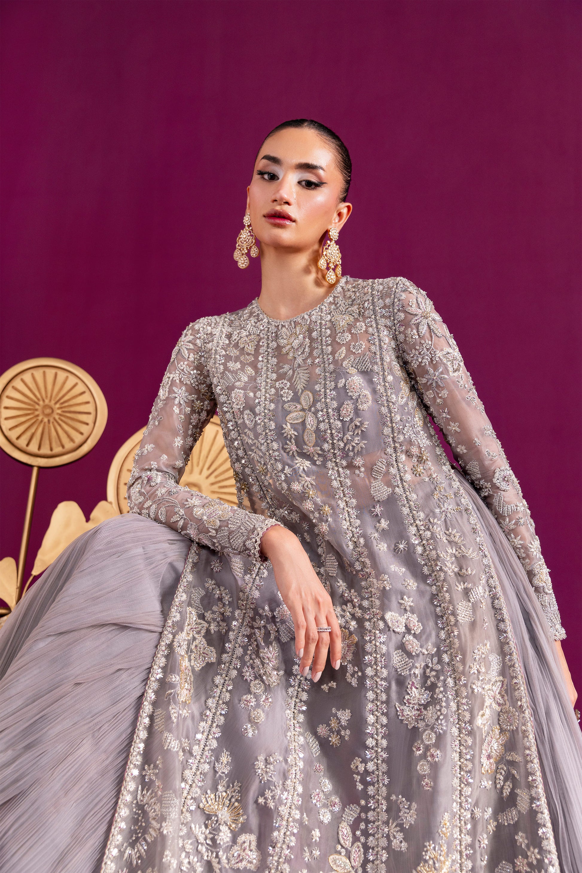 A lyrical canvas where artistry meets regality”. The ensemble blooms like a garden of flora and fauna, its misty grey base shimmering under silver dabka, nakshi, and a constellation of crystal-glass embellishments, delicately framed with makesh work.
