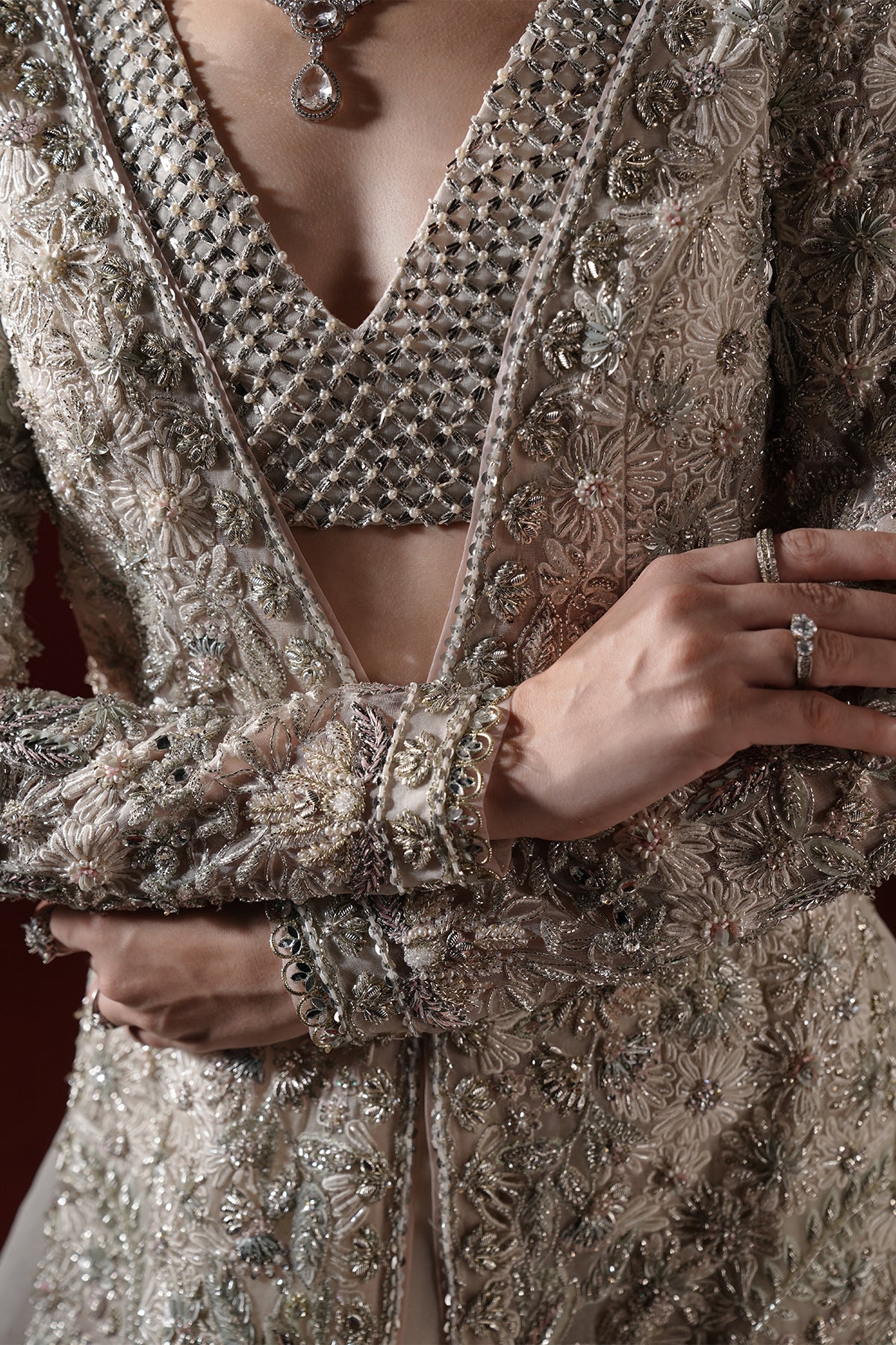 Each stitch tells a story, ancient and new, cutwork and beadings, pairing with organza dupatta and ruffled pants, which cascades with whispers of delicacy worn. A vision of beauty, fashion-forward and rare, a masterpiece crafted, ethereal, and pristine.