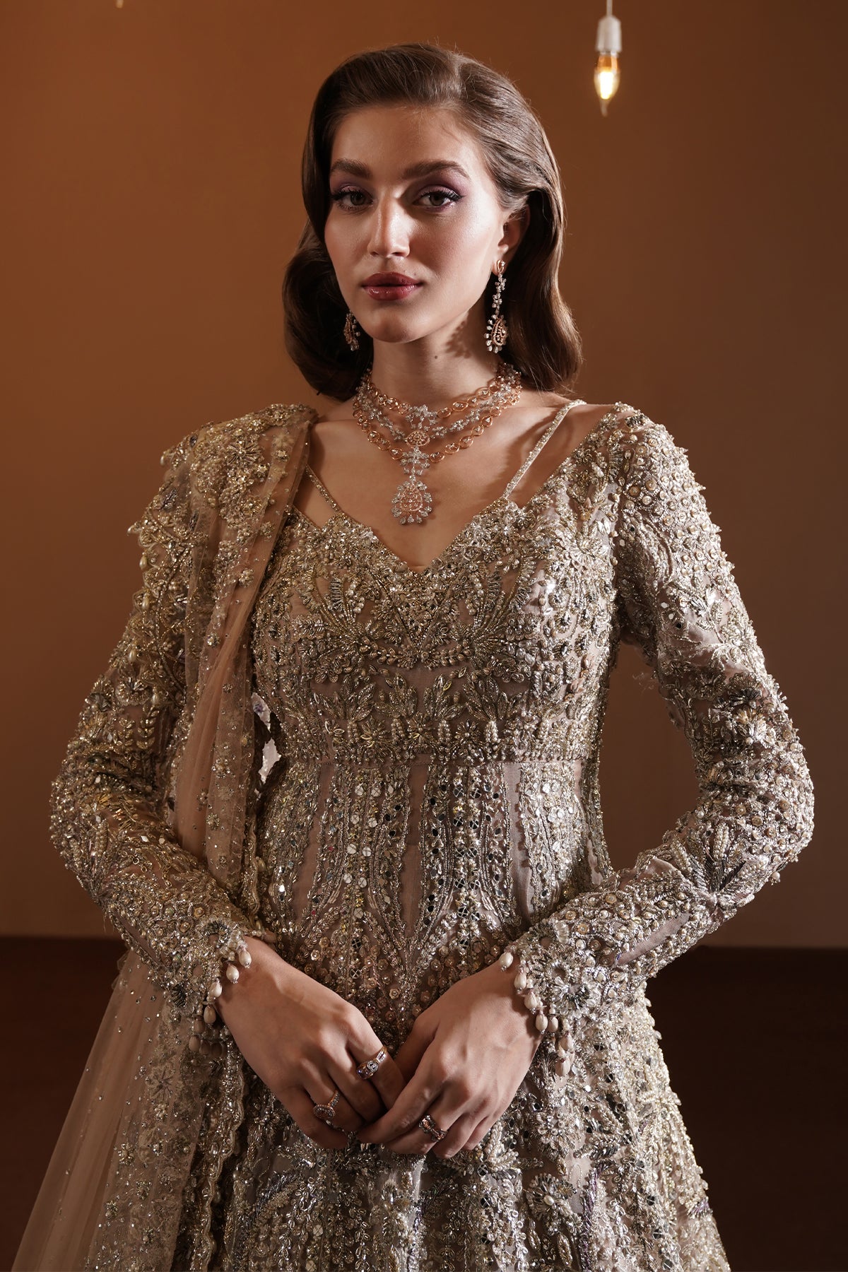 The dupatta, a dream in the air, a net of enchantment, light as a prayer. With double scallops that dance and entwine, sequins like stars, in a celestial line. Together, they shimmer, a harmony rare, Ganga Jamna, a tale of love laid bare. In every embellishment, a world to explore, craftsmanship and beauty, forever to adore.