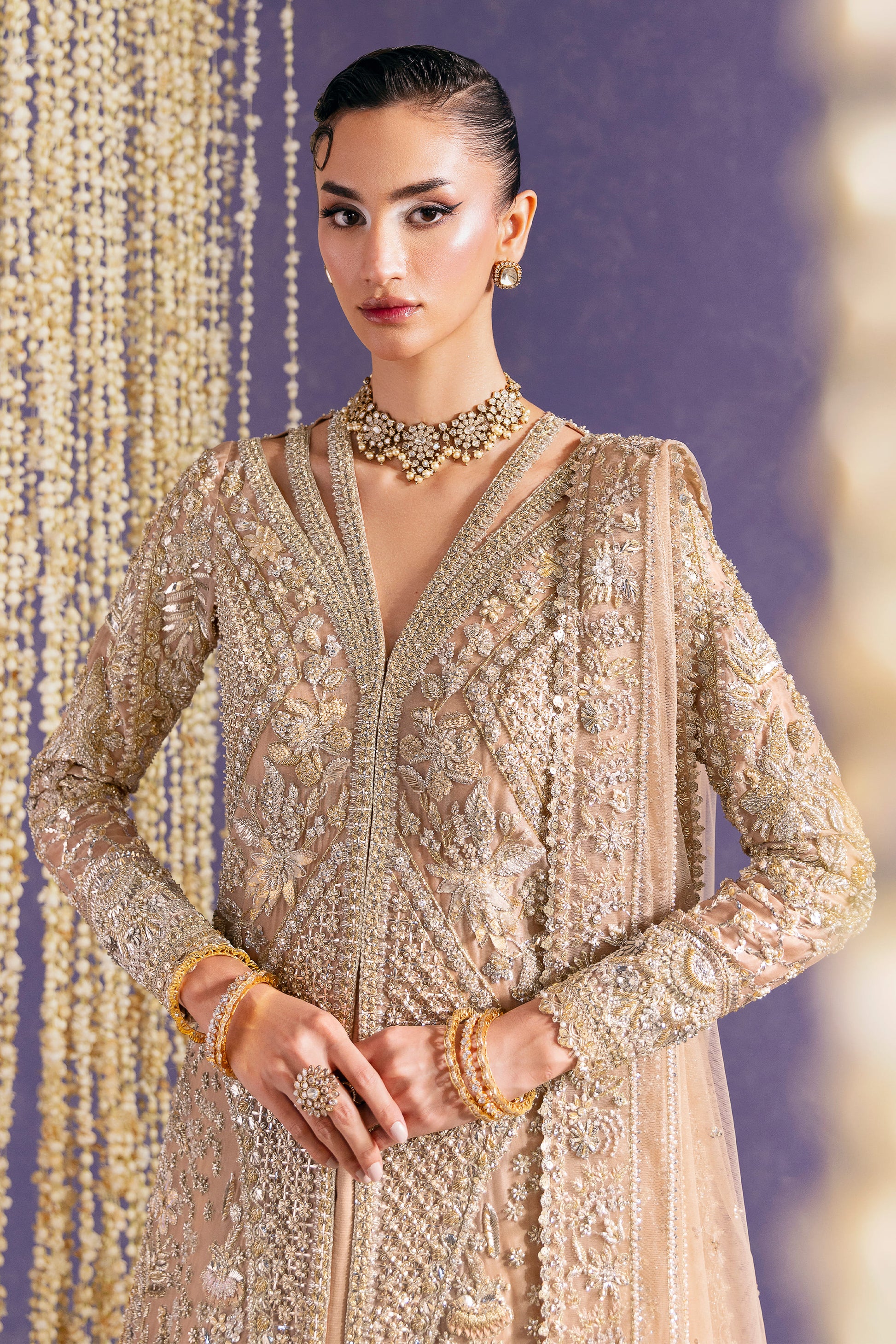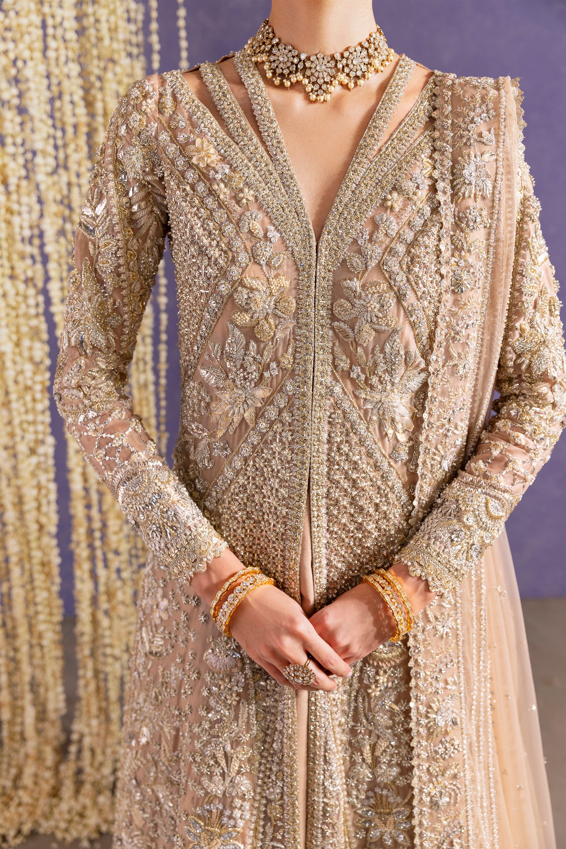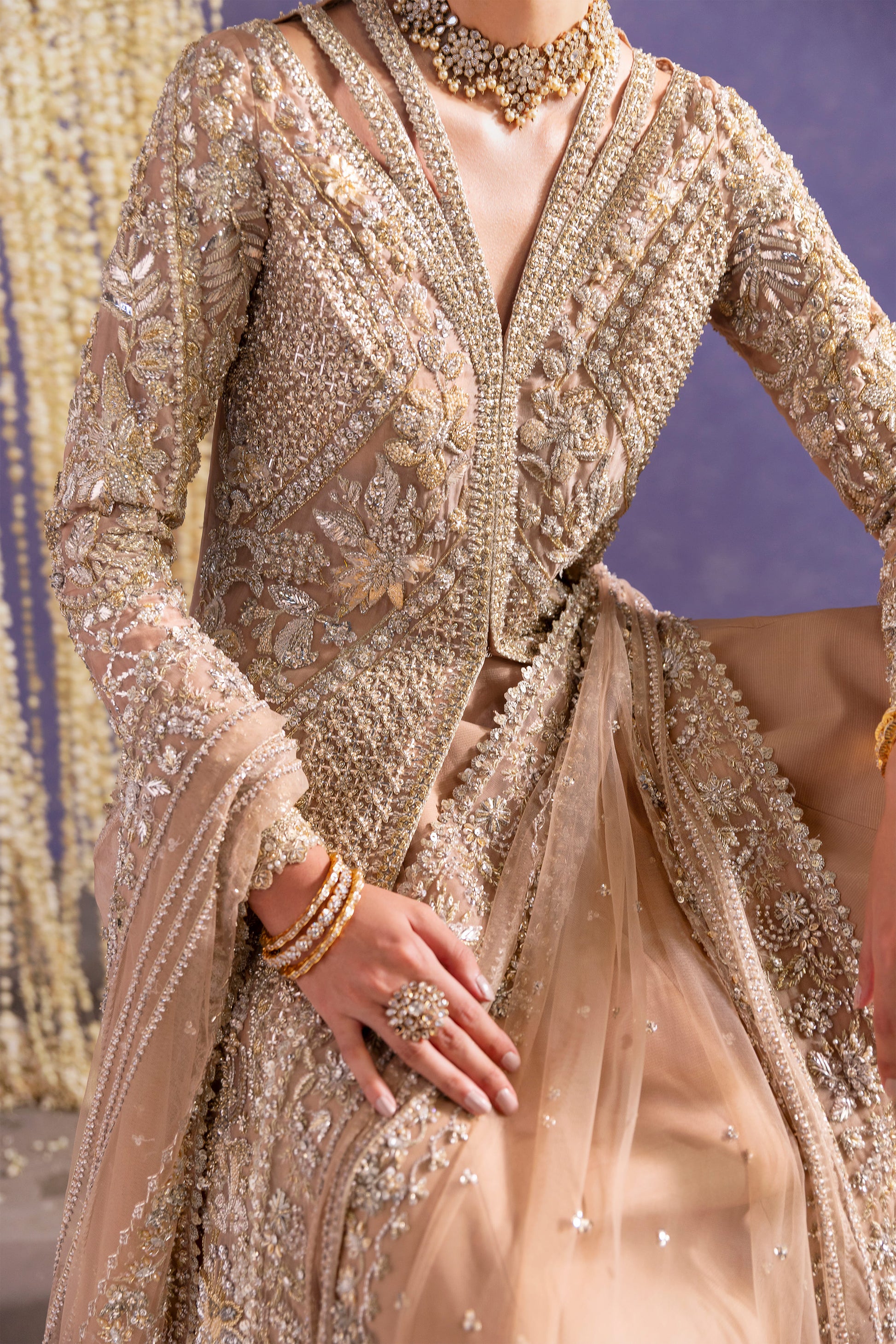 The peshwas, relaxed yet voluminous, radiates festivity while flattering with effortless grace, and the net dupatta, bordered with intricate opulence and scattered with a delicate chan, completes the symphony of bridal brilliance. The ensemble “where gold whispers, silver answers, and together, they shape a bride’s grandeur.