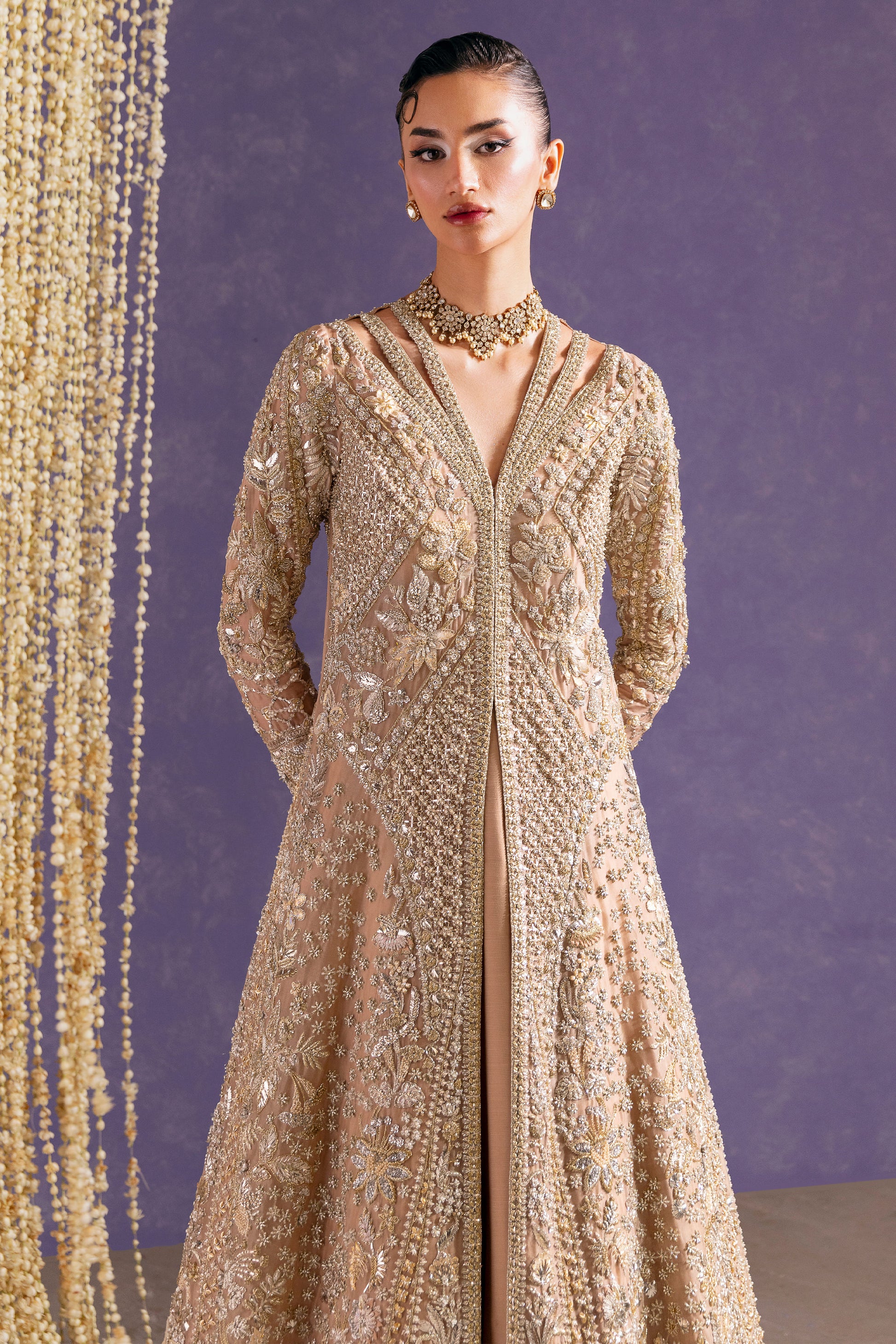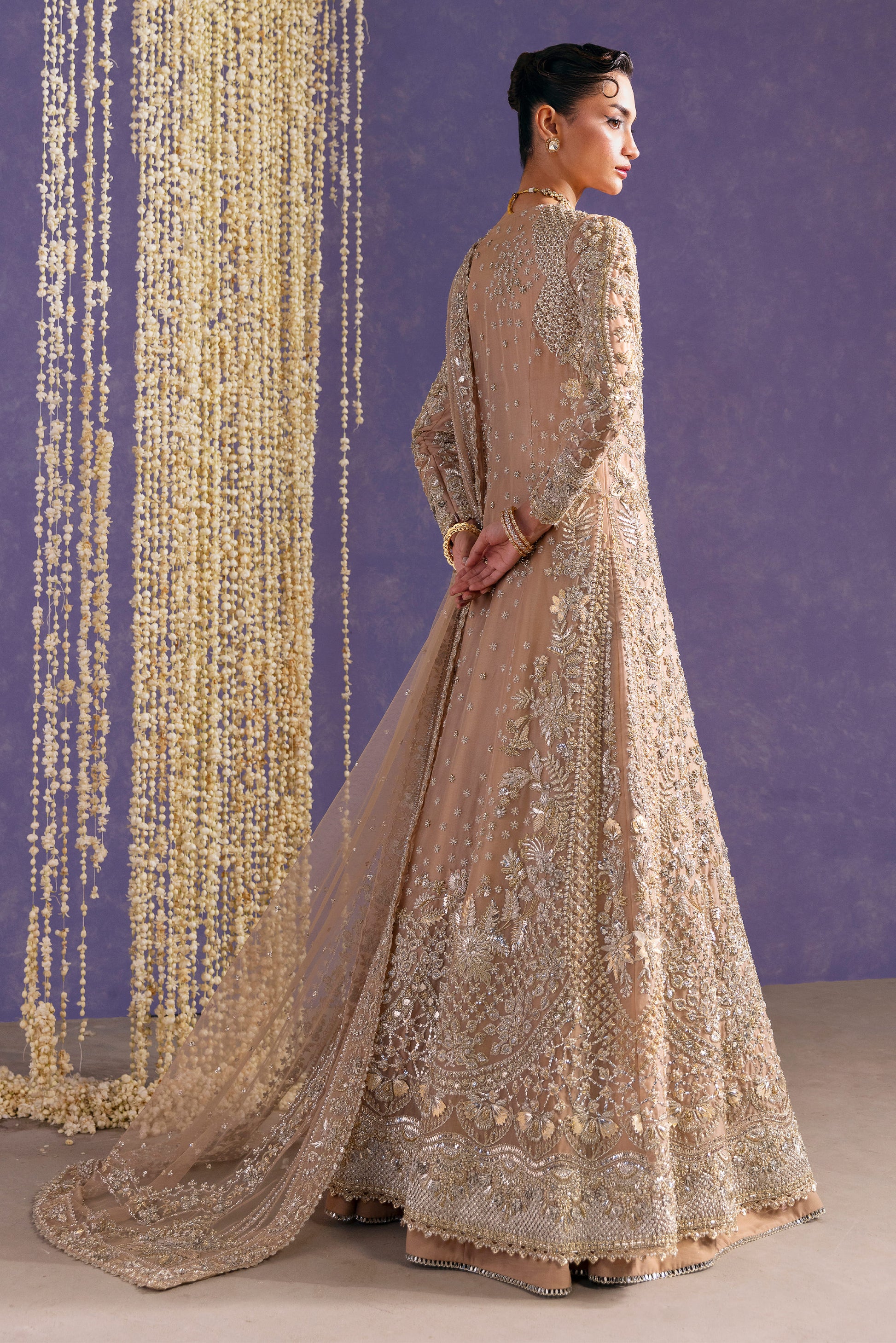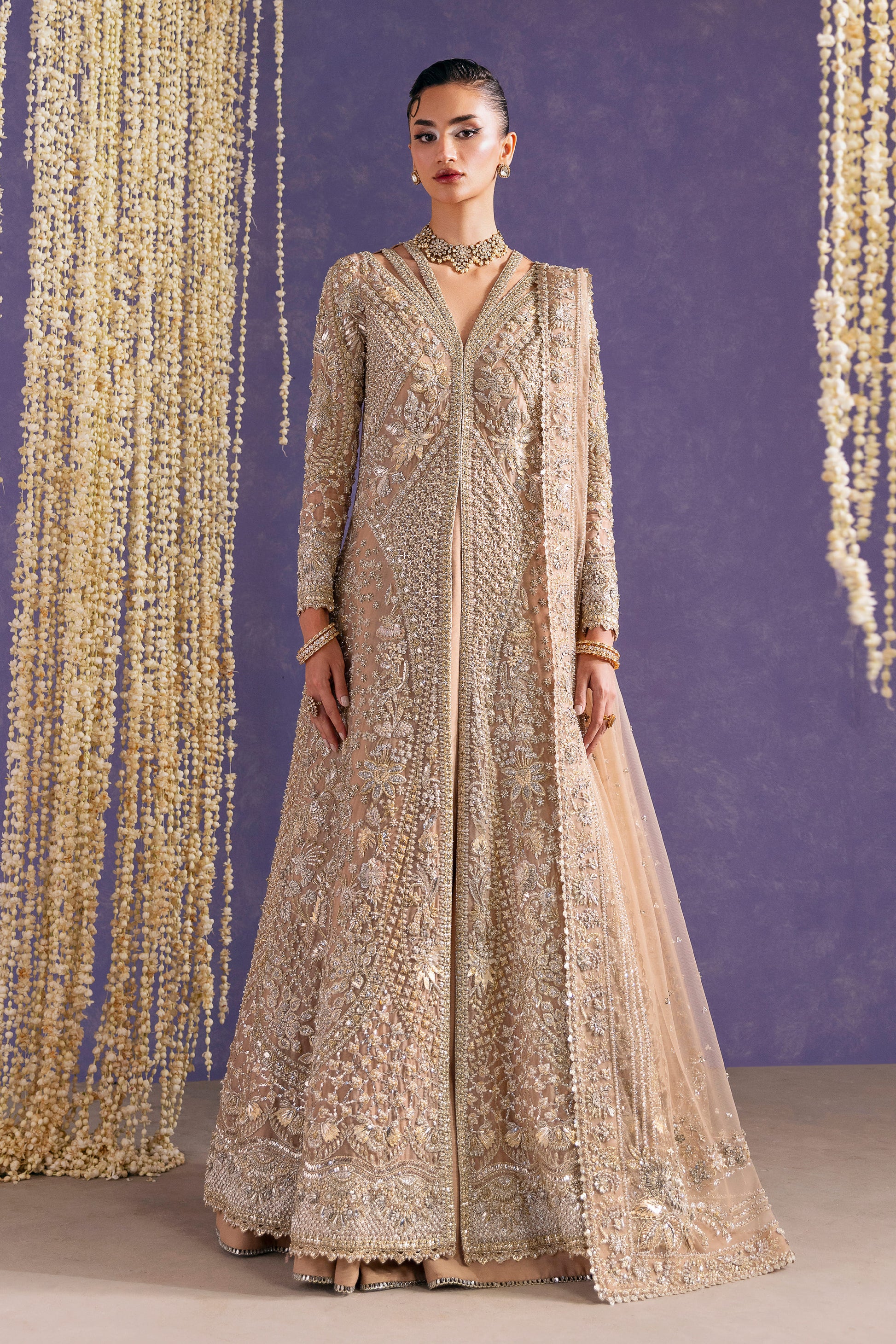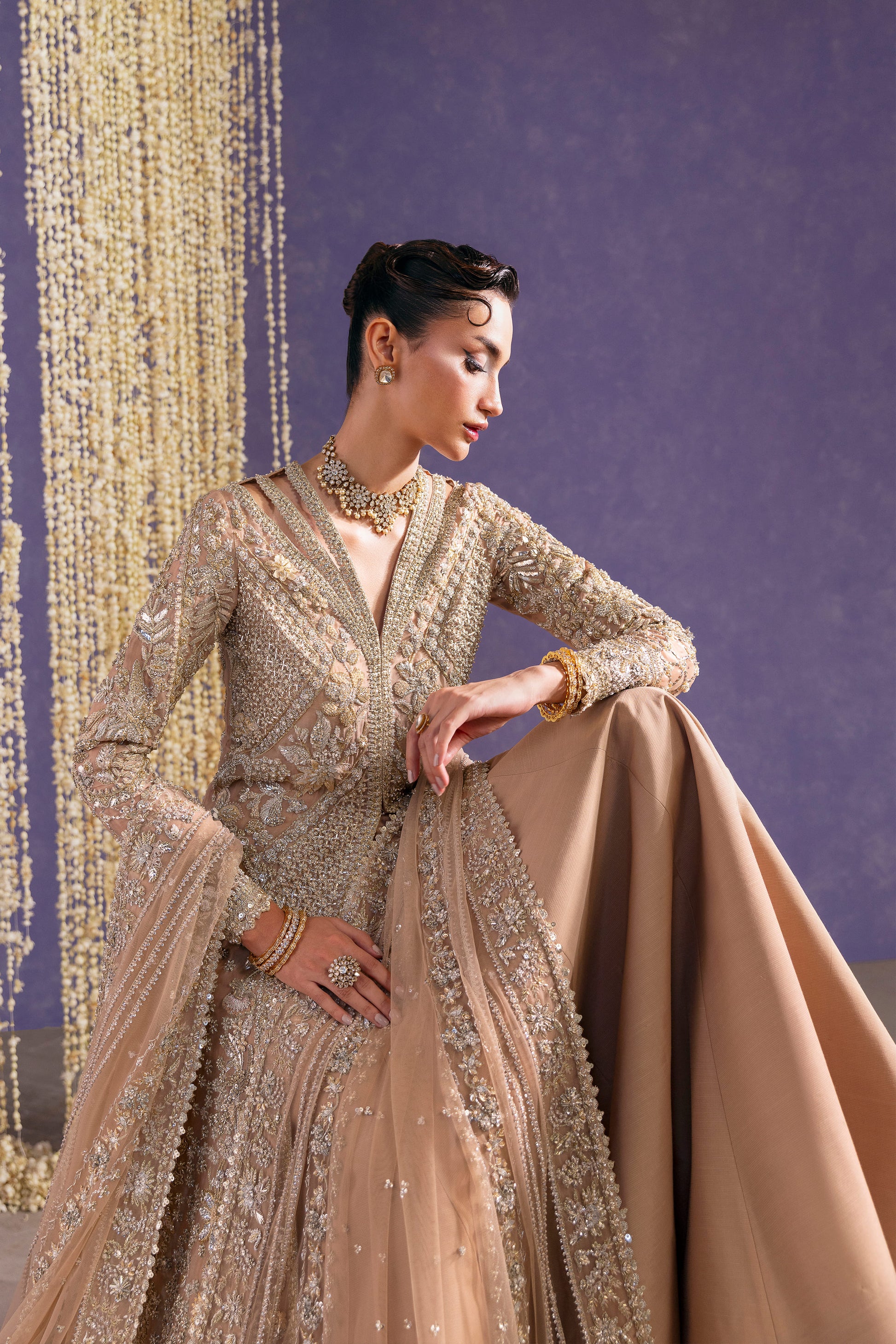 The peshwas, relaxed yet voluminous, radiates festivity while flattering with effortless grace, and the net dupatta, bordered with intricate opulence and scattered with a delicate chan, completes the symphony of bridal brilliance. The ensemble “where gold whispers, silver answers, and together, they shape a bride’s grandeur.