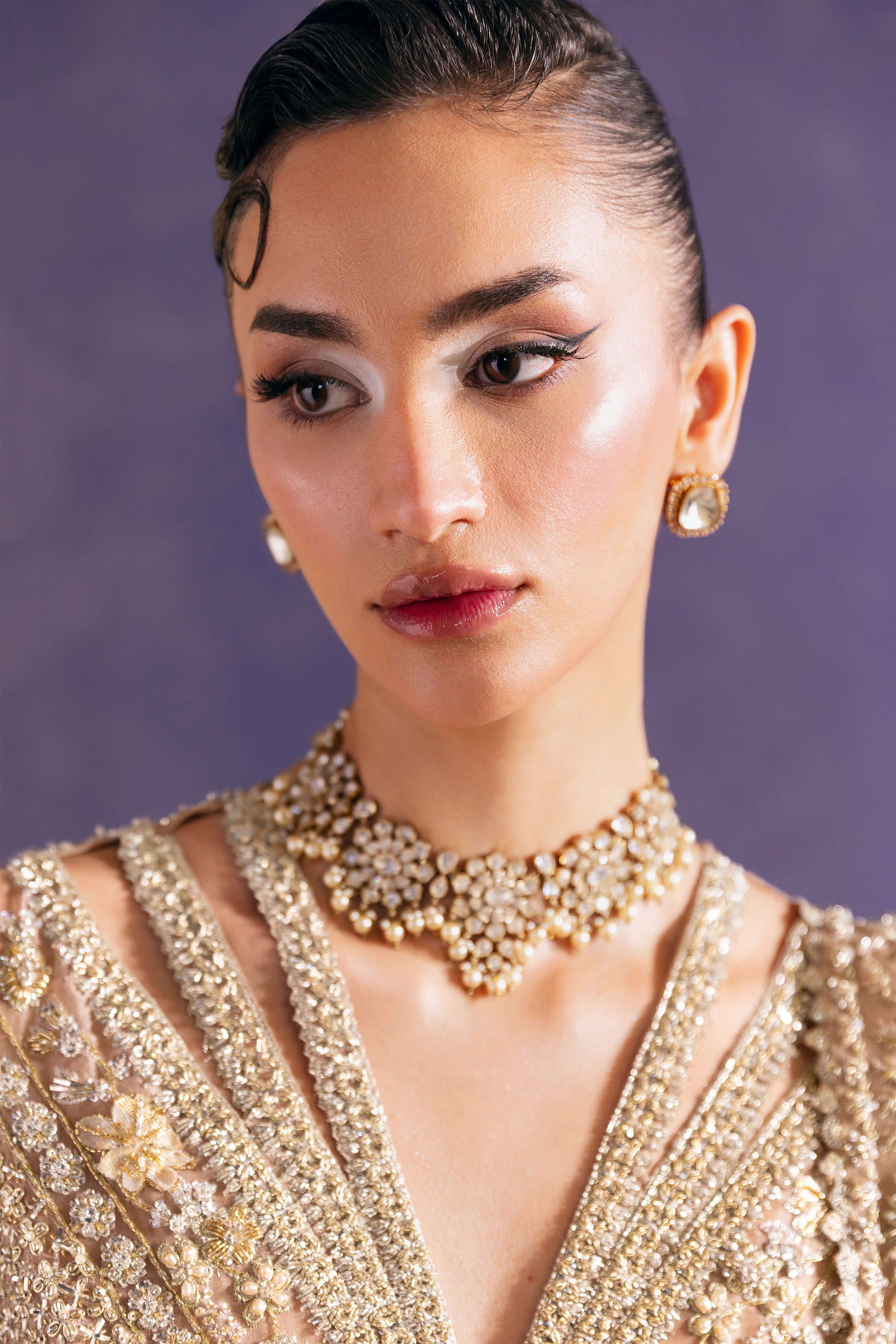 Sculpted into a silhouette that gleams with grandeur, regality, and the poetry of craft.” Inspired by the classical Ganga-Jamna tradition, this bridal is softly crafted in the artful separation, blending, and intersecting of radiant gold and silver—woven into a compositional maze where florals entwine with geometry to create a mesmerizing vision.