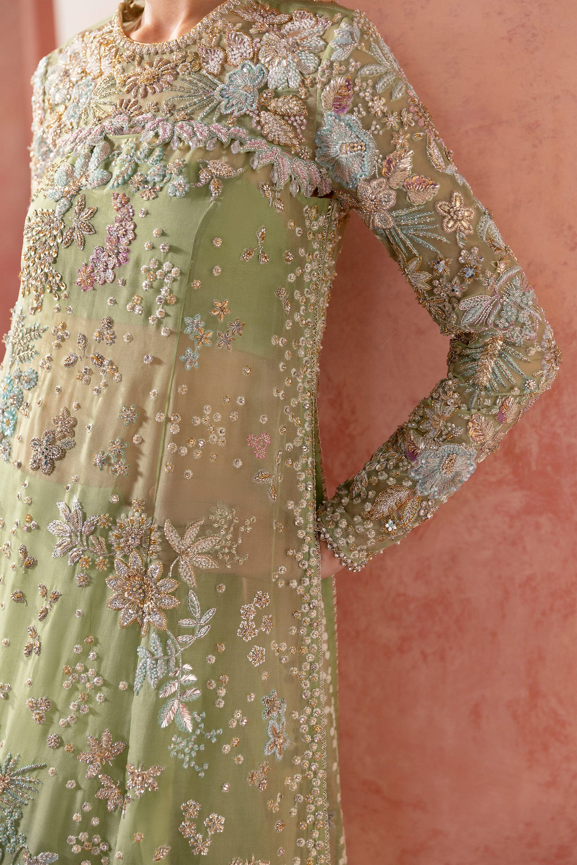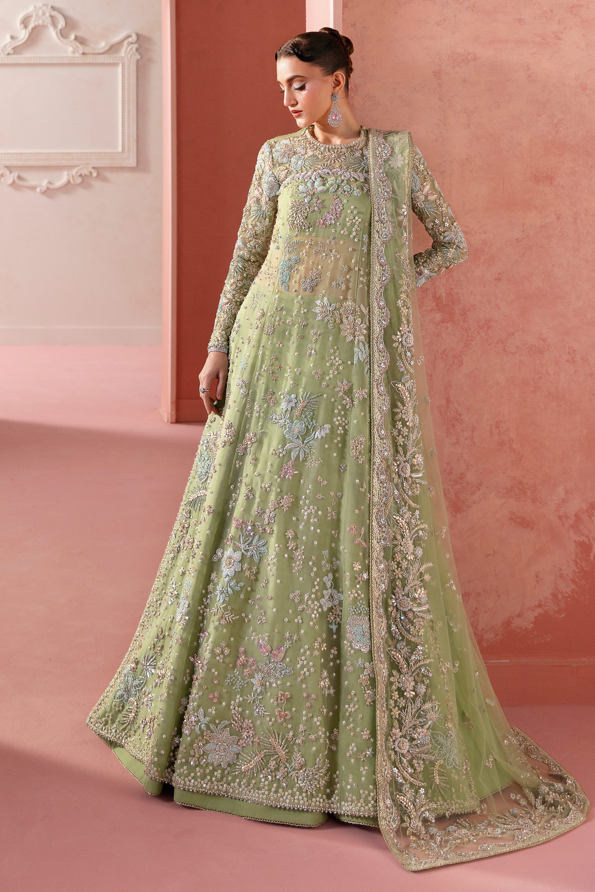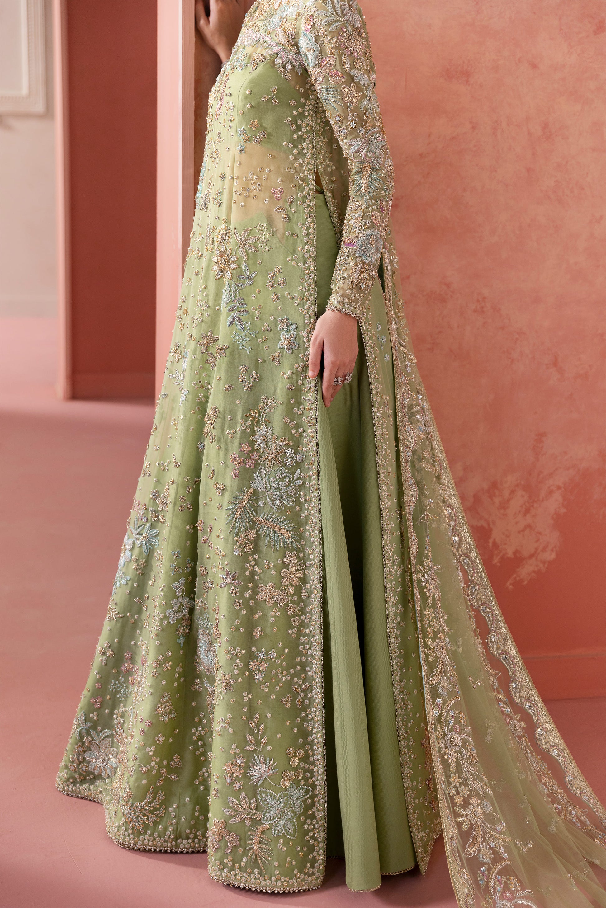 In powder opaline green, the ensemble becomes a celestial canvas where florals bloom like constellations — from tender buds to radiant blossoms scattered across the horizon