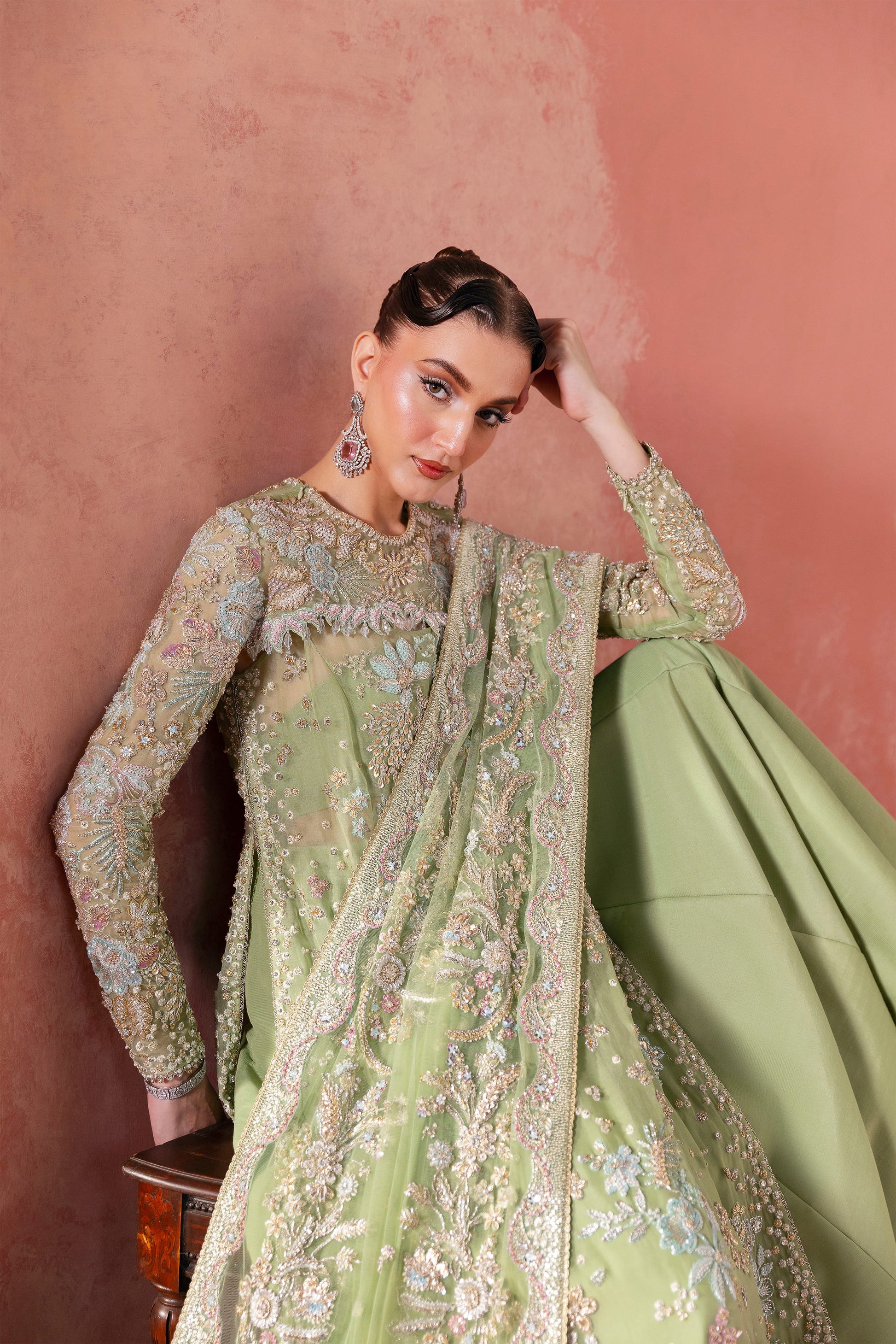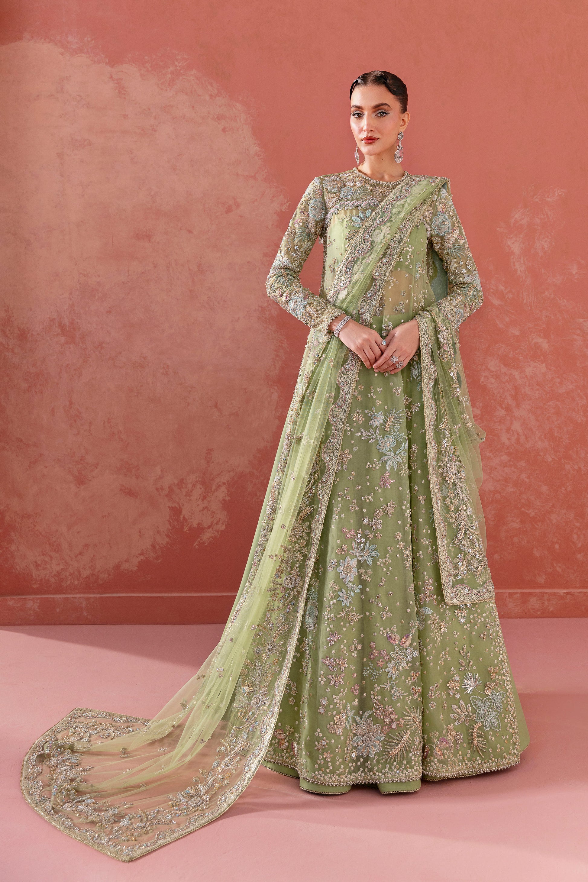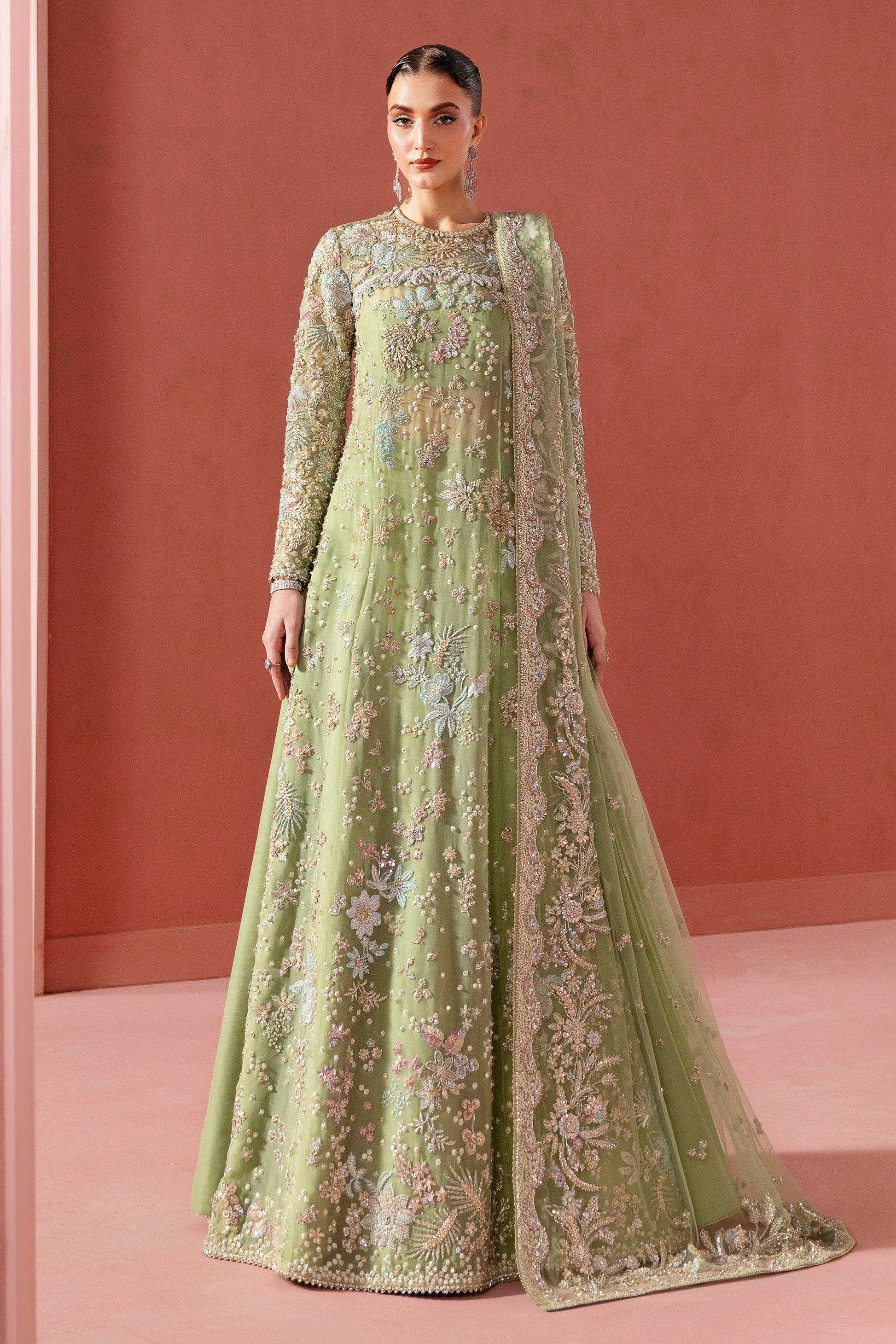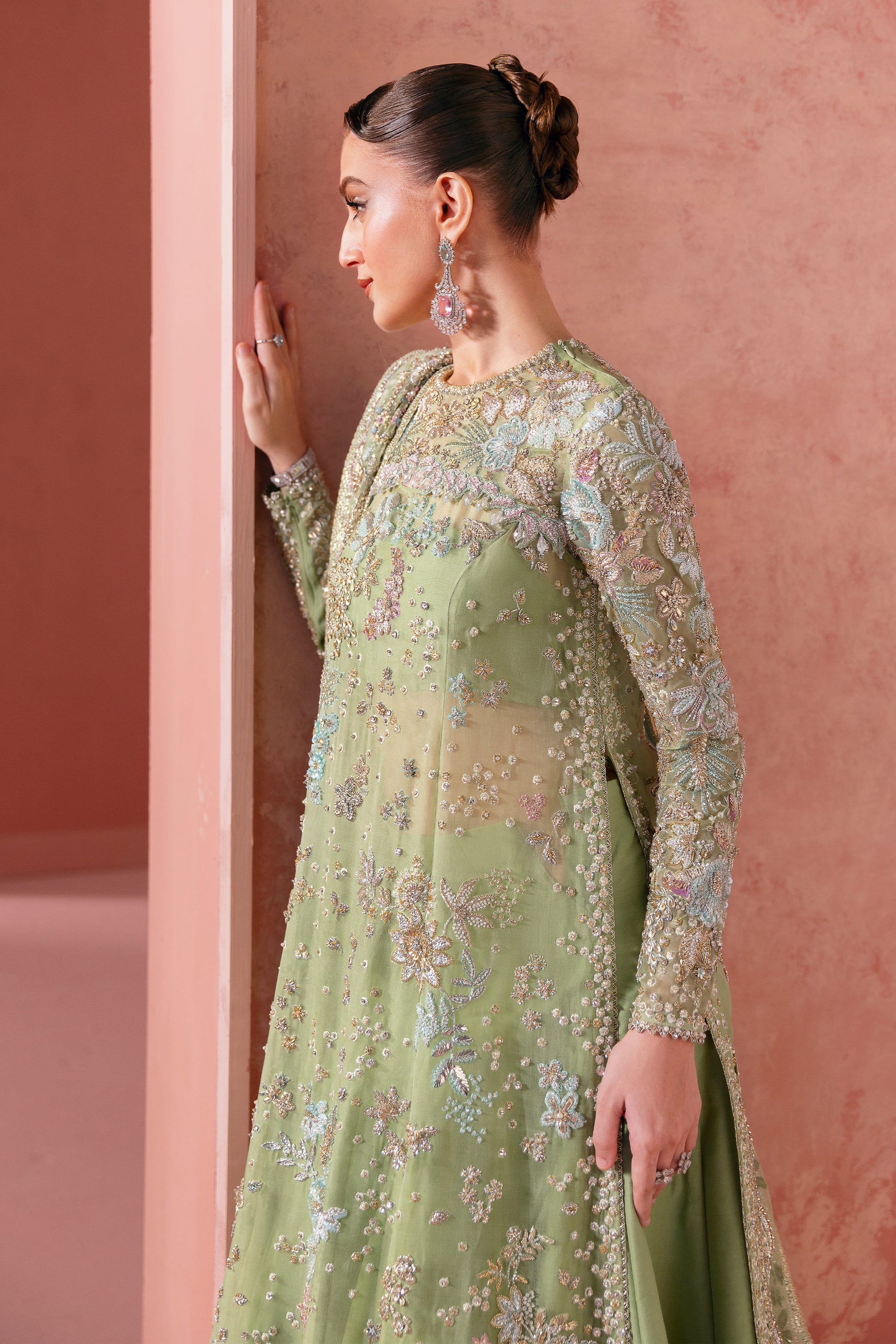 In powder opaline green, the ensemble becomes a celestial canvas where florals bloom like constellations — from tender buds to radiant blossoms scattered across the horizon