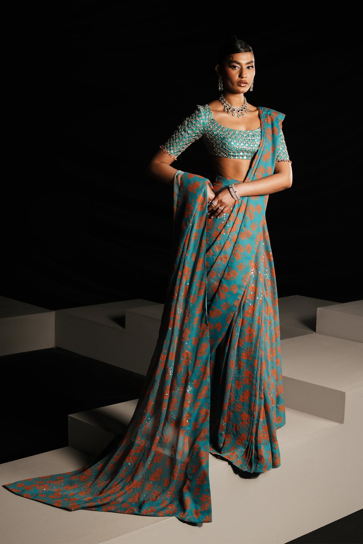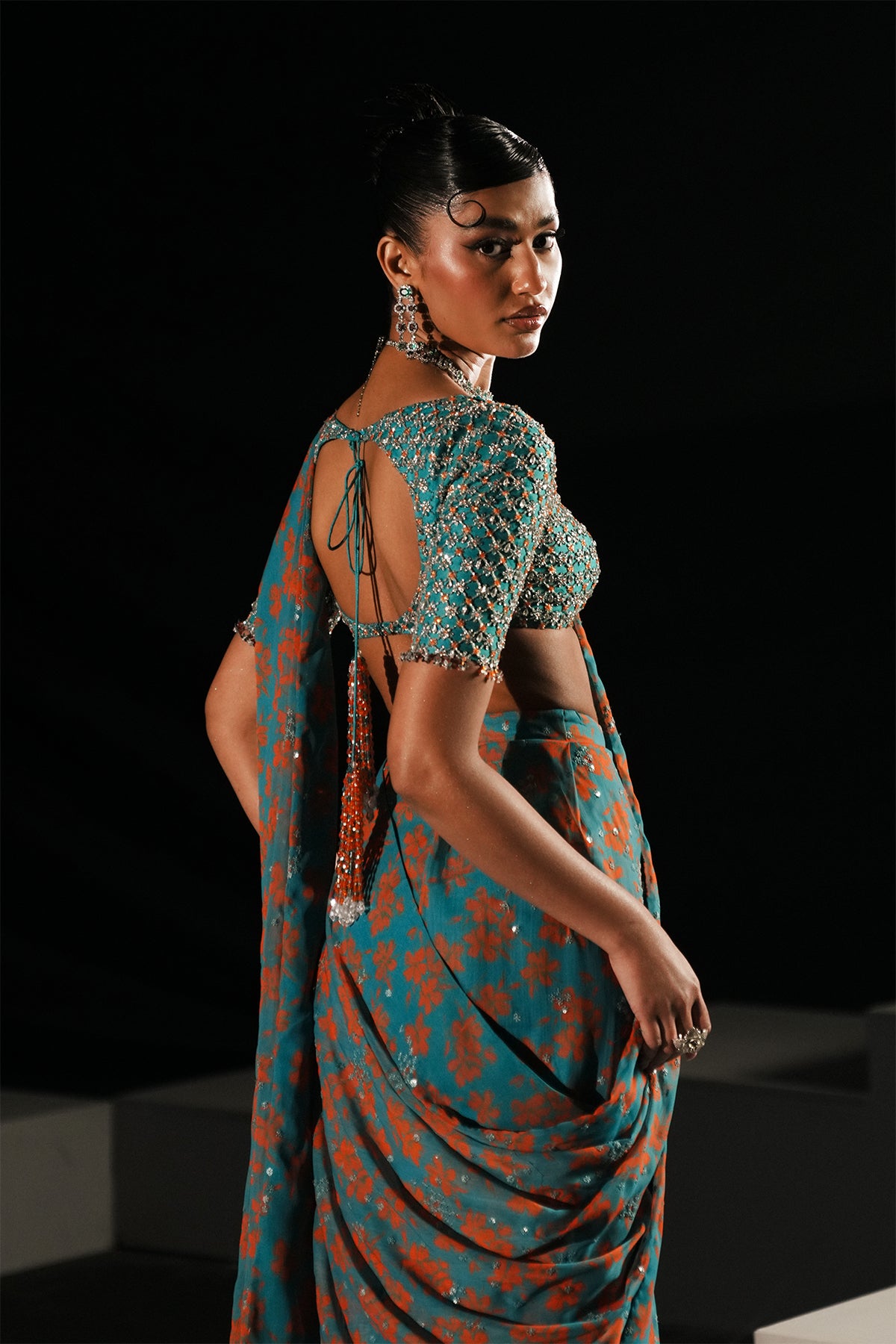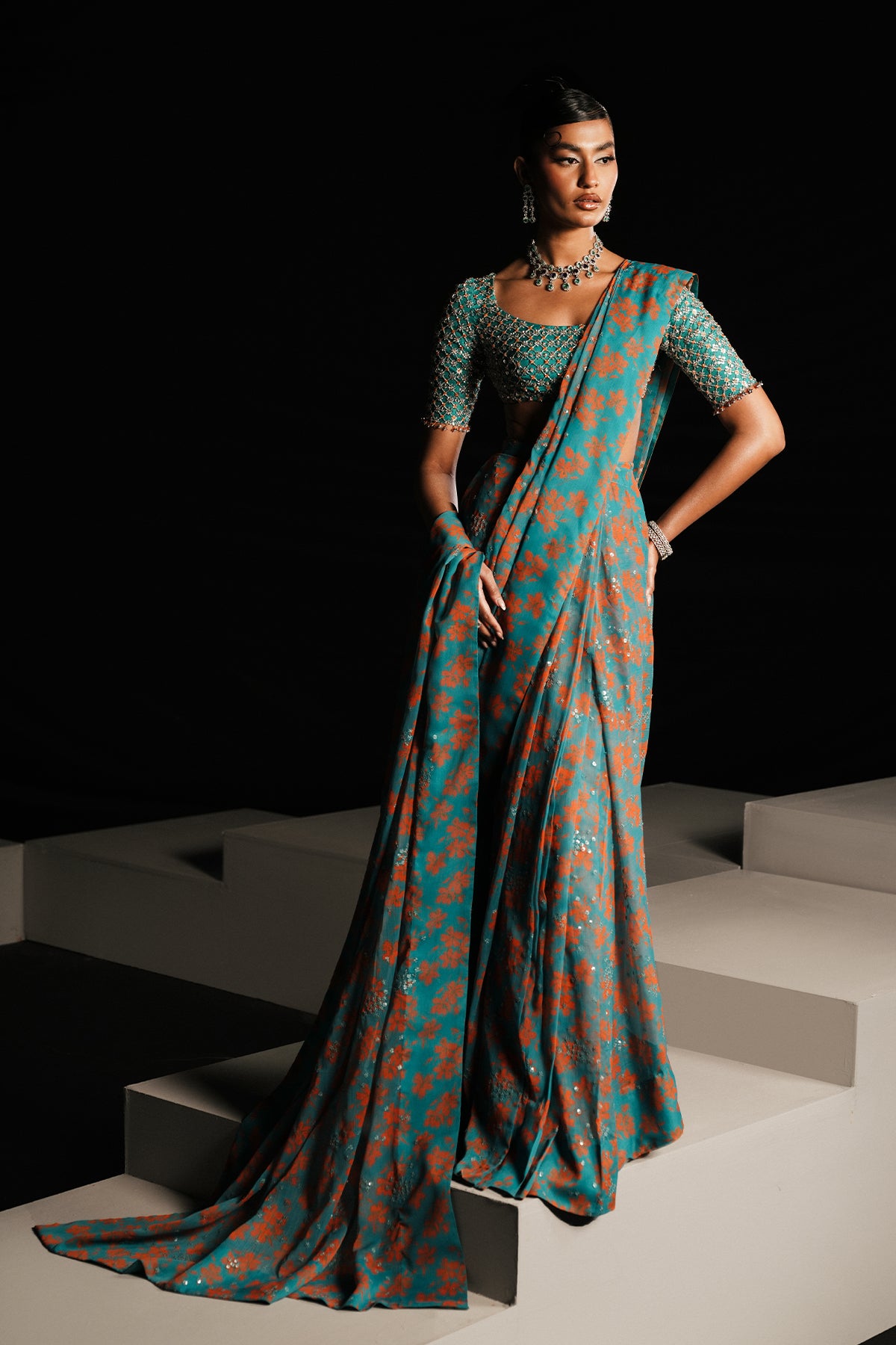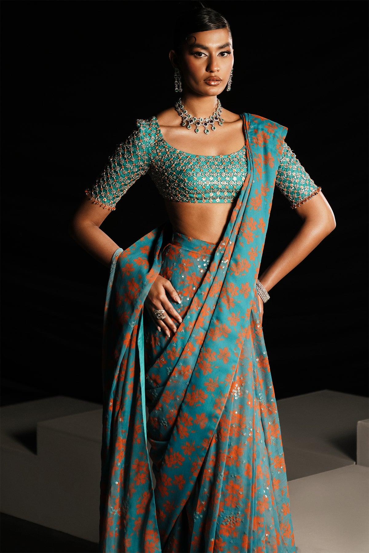 Drenched in vibrant teal and tangerine, this chiffon saree features fluid printed drapes finished with shimmering water-sequins paired with a strikingly embellished blouse adorned with geometric beadwork, it embodies contemporary luxury with effortless elegance.