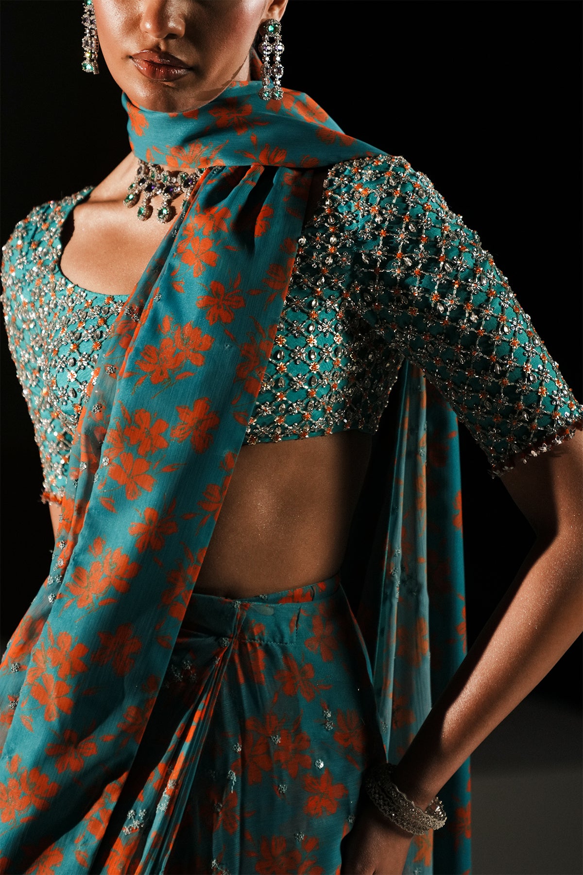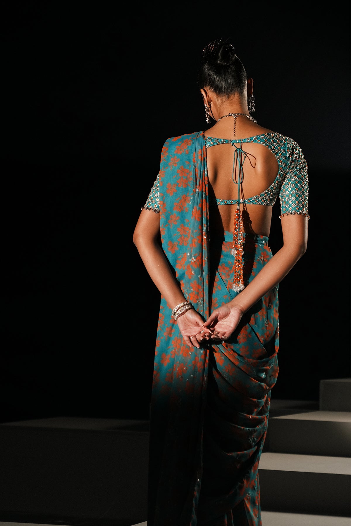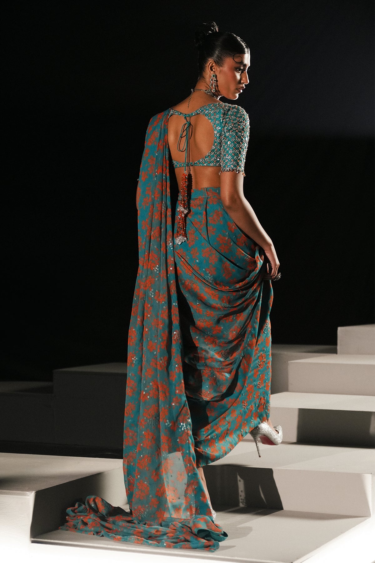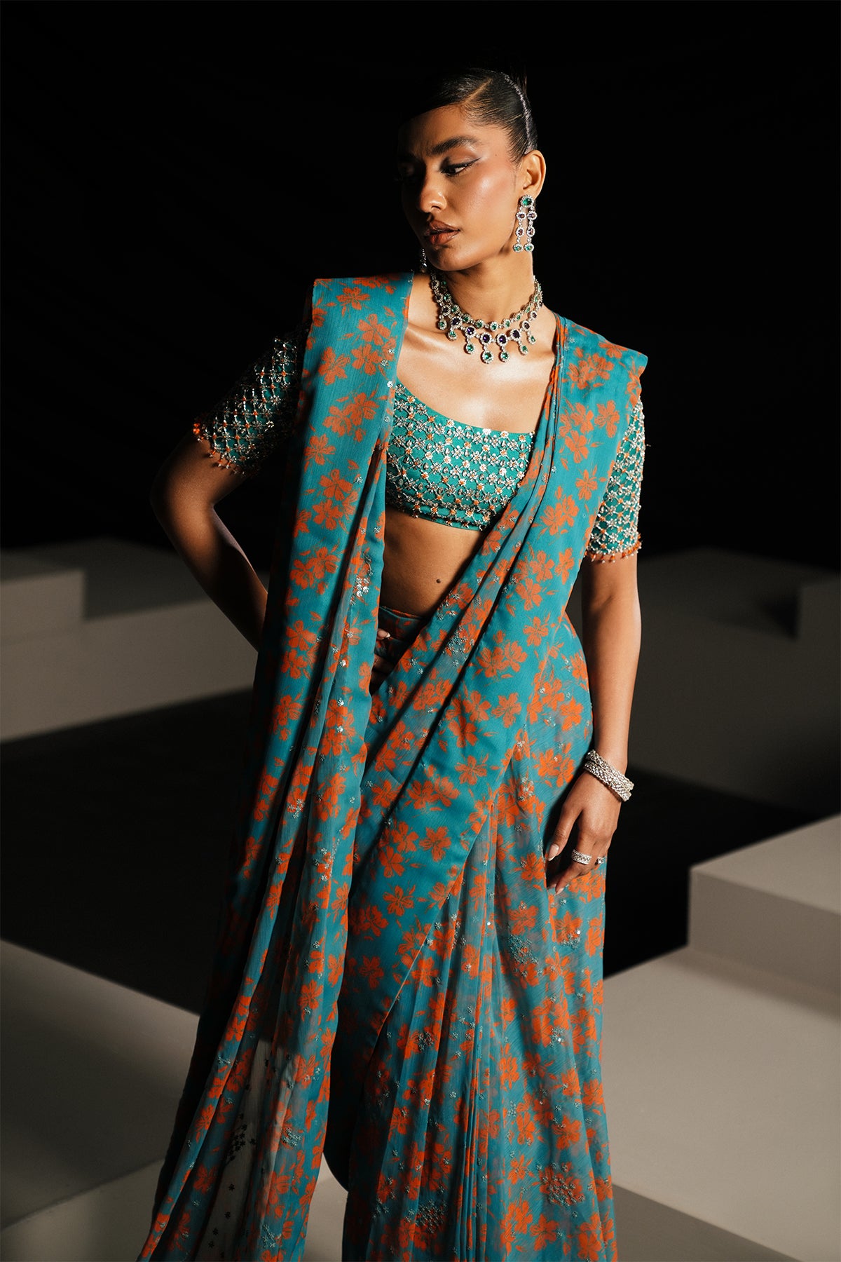 Drenched in vibrant teal and tangerine, this chiffon saree features fluid printed drapes finished with shimmering water-sequins paired with a strikingly embellished blouse adorned with geometric beadwork, it embodies contemporary luxury with effortless elegance.
